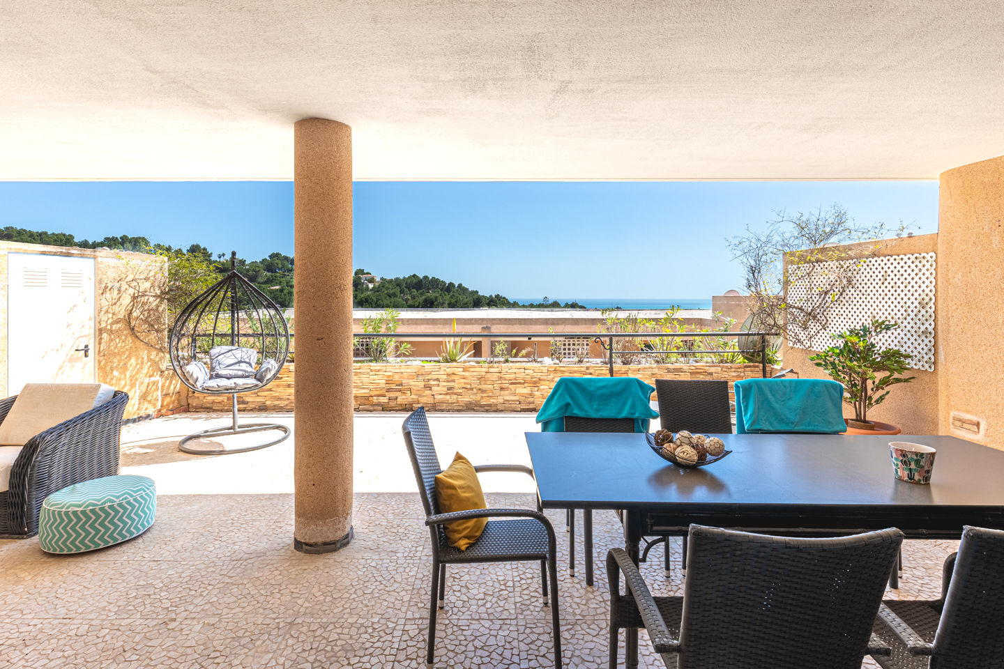 The apartment has 4 bedrooms and 2 bathrooms. The accommodation offers privacy, a lawned communal garden with trees, and beautiful views of the sea and the garden. Its comfort and the proximity of the beach, places to shop, sports activities, nightlife, sights, and culture make this a fine apartment to spend your holidays in Spain with family or friends.