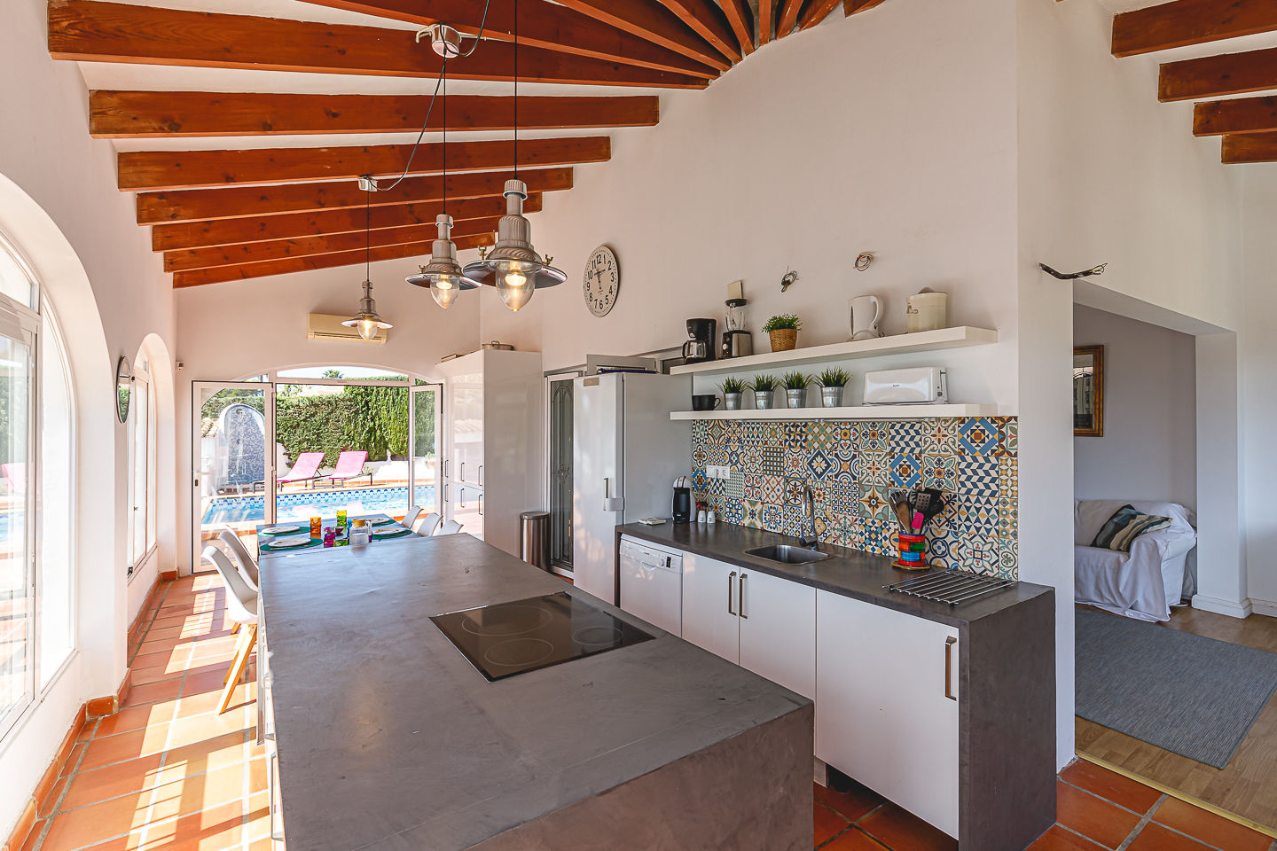 The house has 4 bedrooms and 3 bathrooms, spread over 2 levels. The accommodation offers privacy, a garden with gravel and trees, and a beautiful pool. Its comfort and the proximity to the beach, places to shop, and sports activities make this a fine holiday house to spend your holidays in Spain with family or friends.