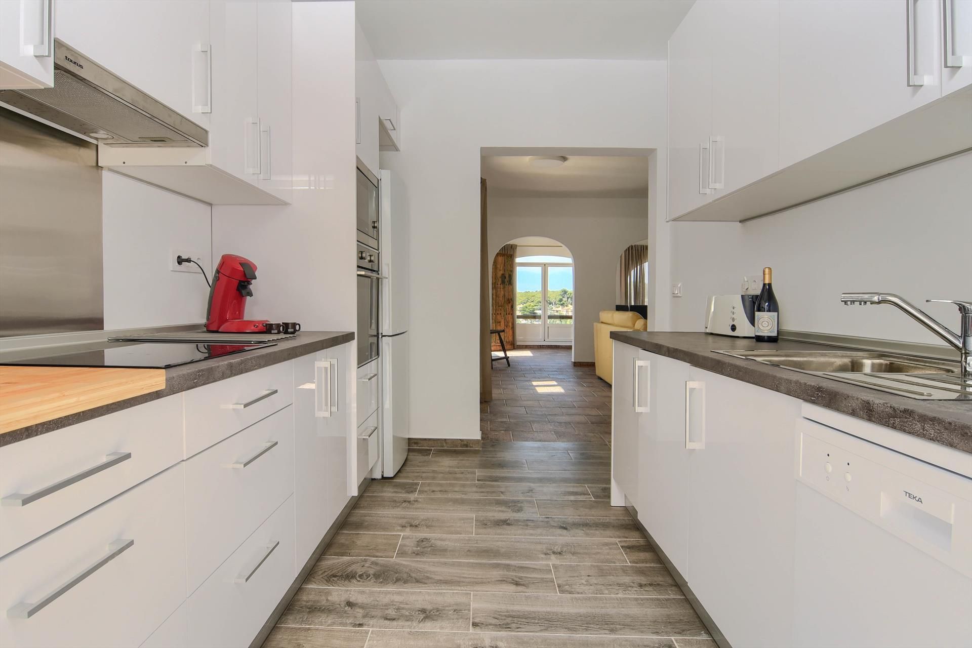 • open kitchen with electric hob, electric oven, microwave, dishwasher, refrigerator-freezer, coffee machine, electric kettle, mixer, toaster and juicer