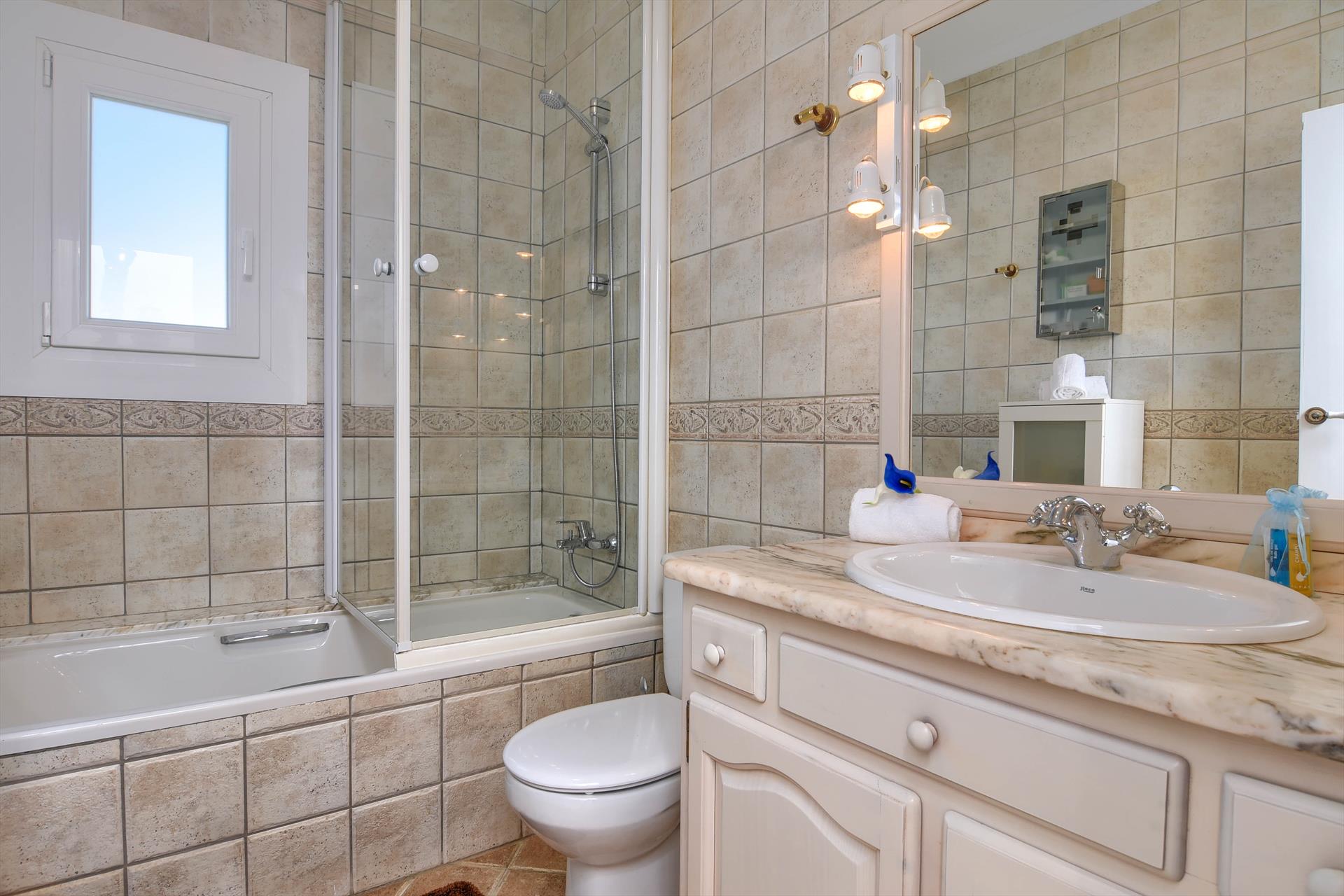 • bathroom with single washbasin, shower and toilet