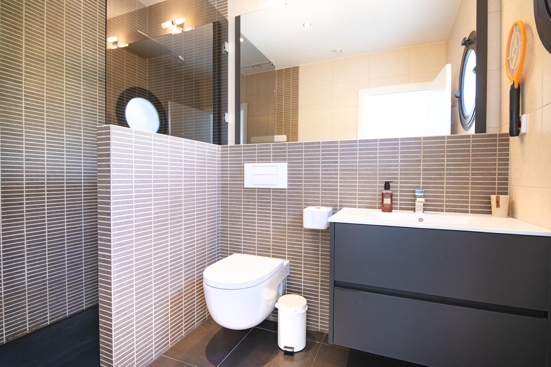 • bathroom with single washbasin, shower and toilet