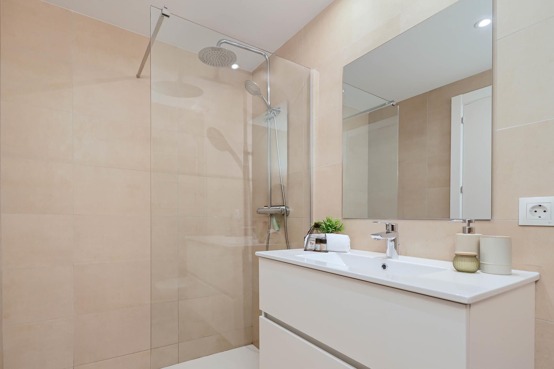 The apartment has 3 bedrooms, 2 bathrooms and 1 guest toilet. The accommodation offers a lawned communal garden with trees and a view of the pool and the garden.