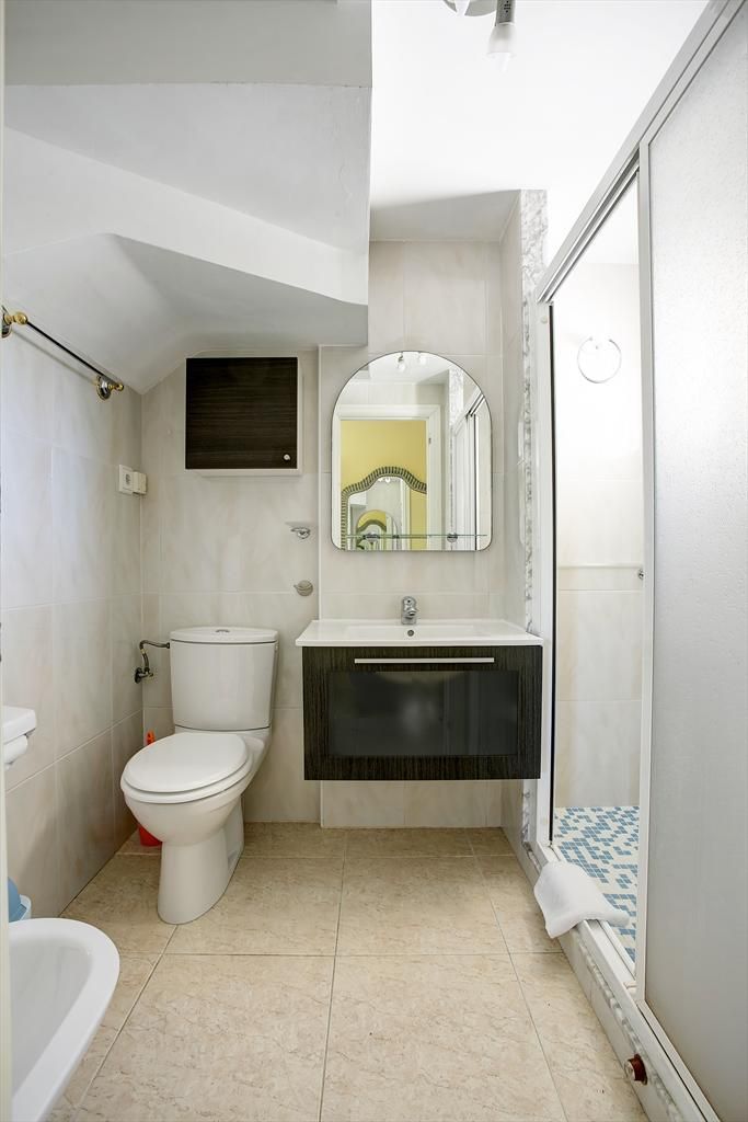 • bathroom with single washbasin, shower and toilet