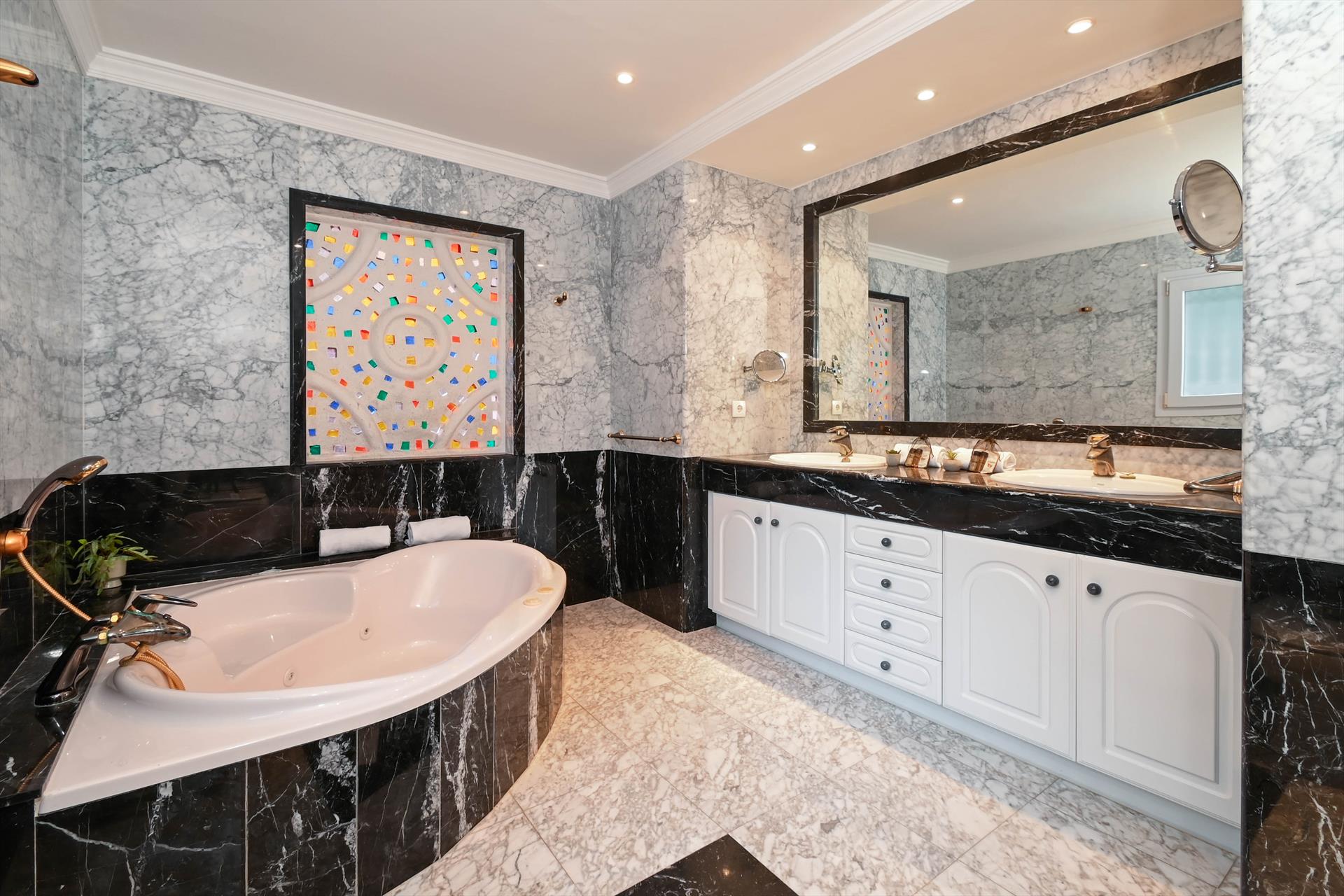 - air-conditioned Master bedroom with double bed, smart television, ceiling fan and en-suite bathroom with double washbasin, jacuzzi batth, bidet and toilet. Small balcony with pool views