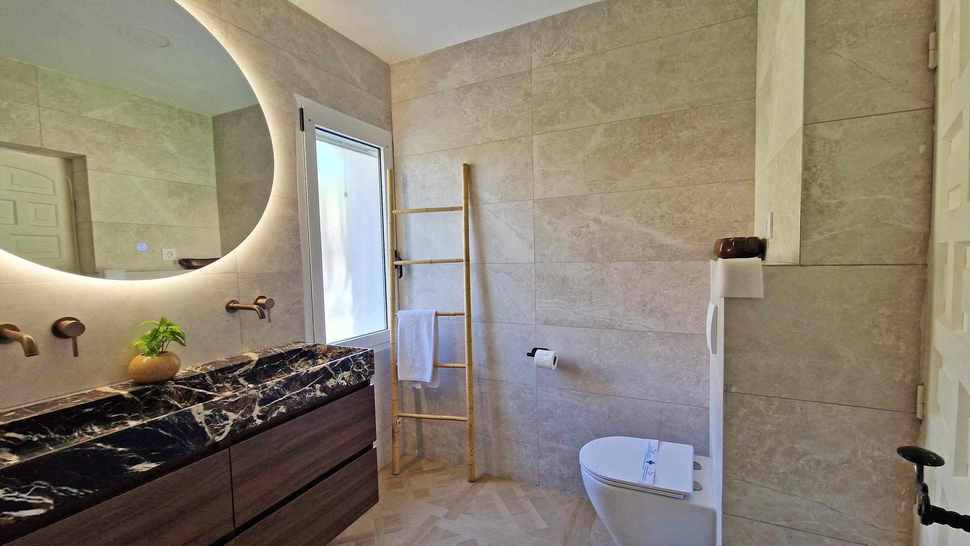 The villa has 6 bedrooms, 3 bathrooms and 1 guest toilet, spread over 2 levels. The accommodation offers privacy, a wonderful lawned garden with gravel and trees, a lovely pool, stunning views of the sea and the mountains, and beautiful views of the beach. Its comfort and the proximity to the beach, shops, sports activities and entertainment make this a fine villa to spend your holidays in Spain with family or friends.