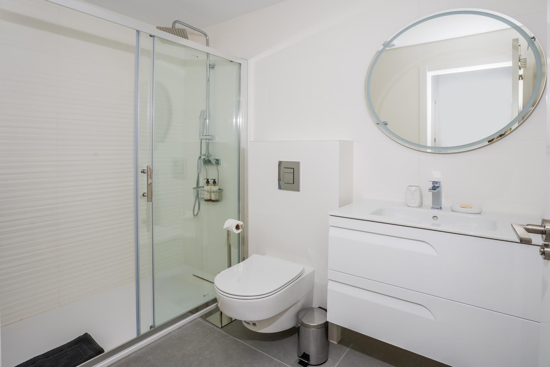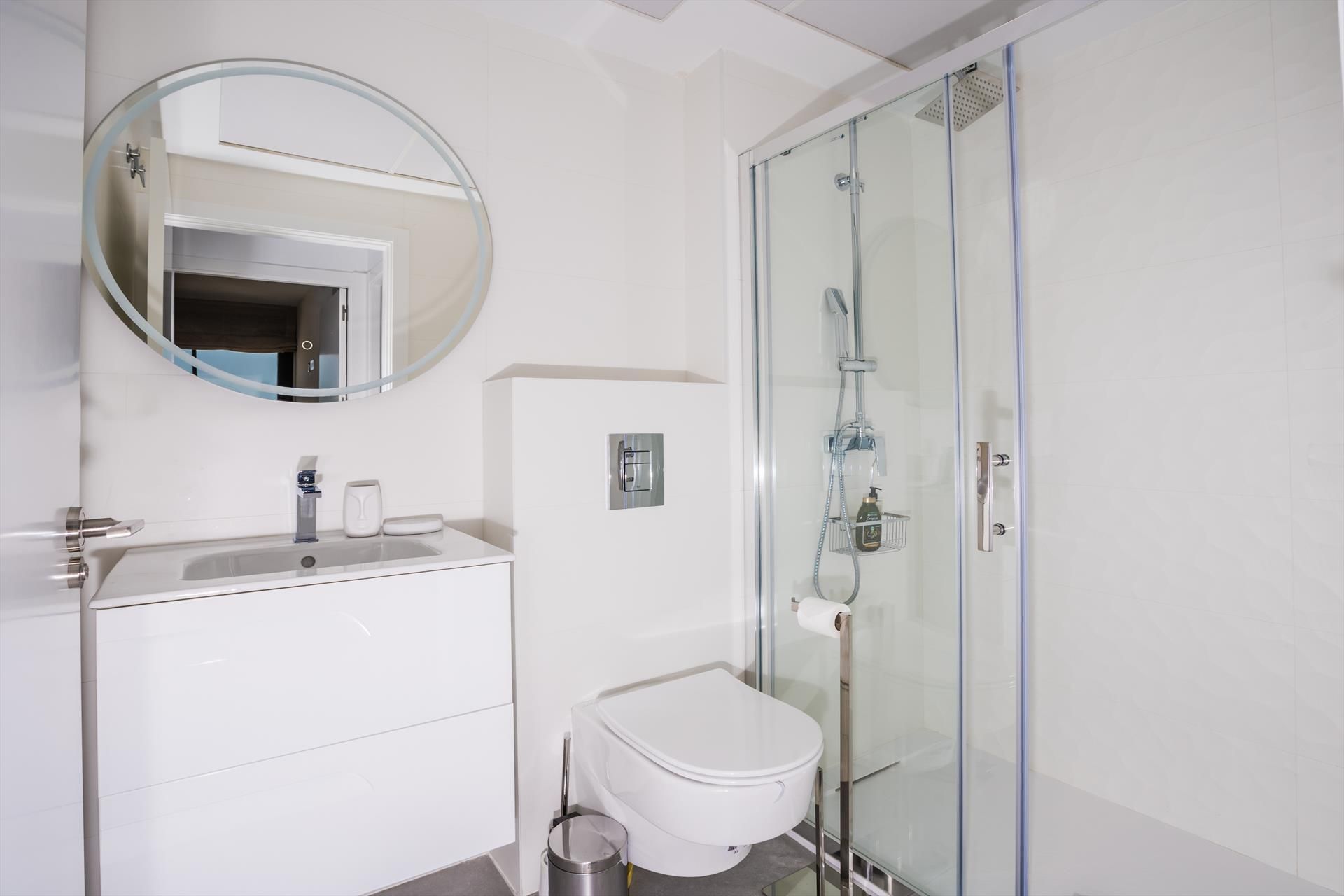 • bathroom with single washbasin, shower, toilet and hairdryer