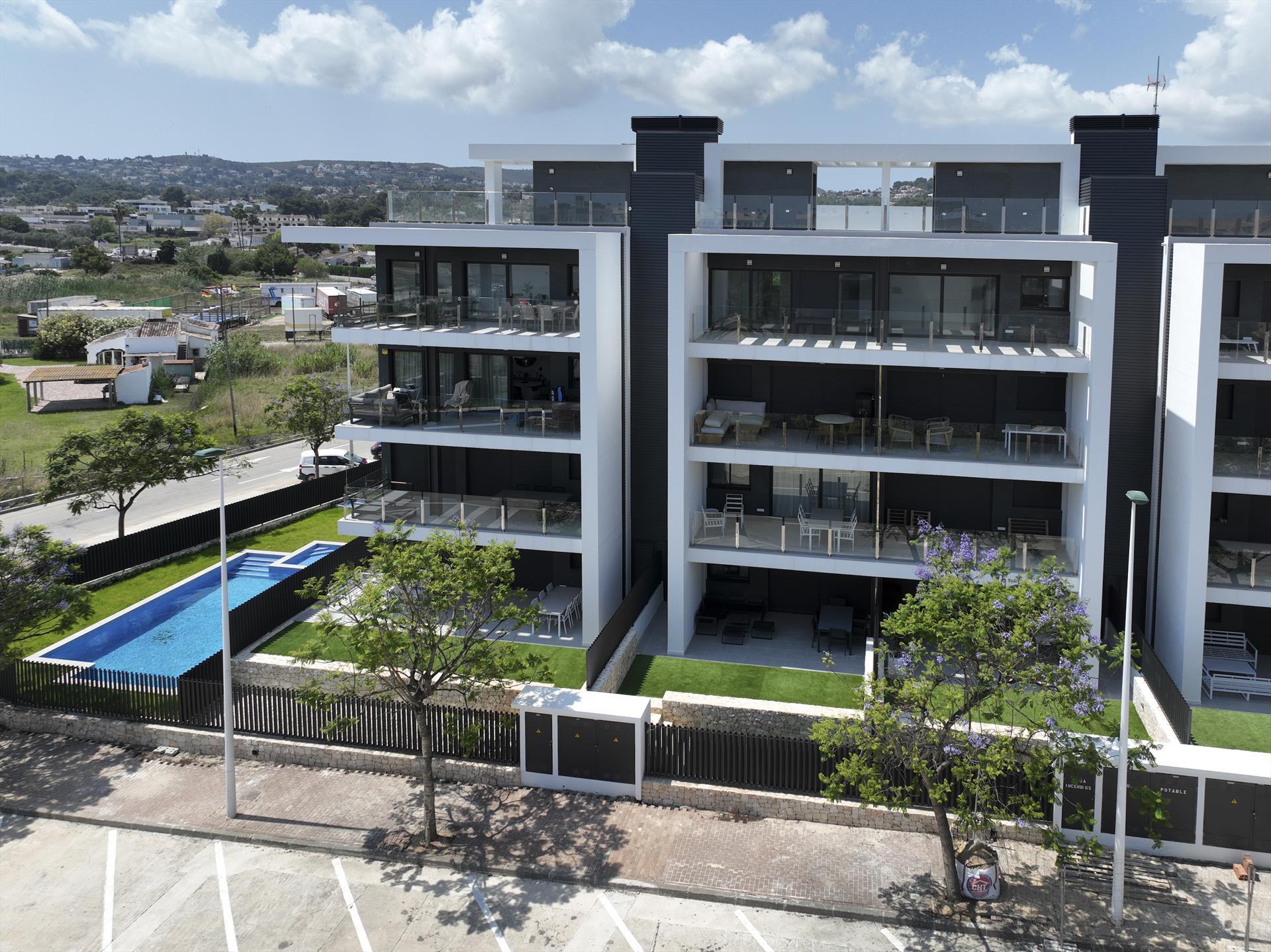 Modern and nice apartment in Jávea, Costa Blanca, Spain with communal pool for 4 persons. The apartment is situated in a residential beach area, close to restaurants and bars, shops, supermarkets and a tennis court, at 500 m from Arenal Beach, at 3 km from Jávea old town and at 500 m from the Mediterranean Sea.