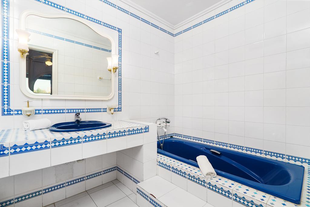 - en-suite bathroom with double washbasin, bath, shower, and toilet