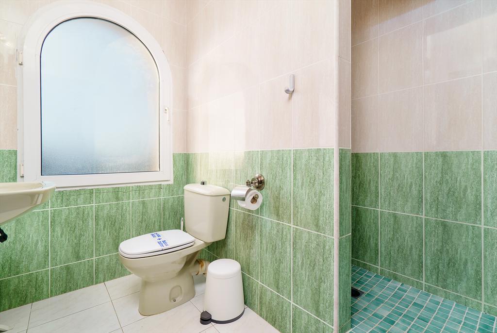 - bathroom with single washbasin, shower, and toilet