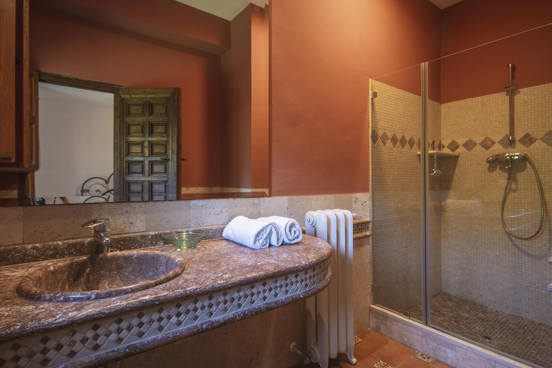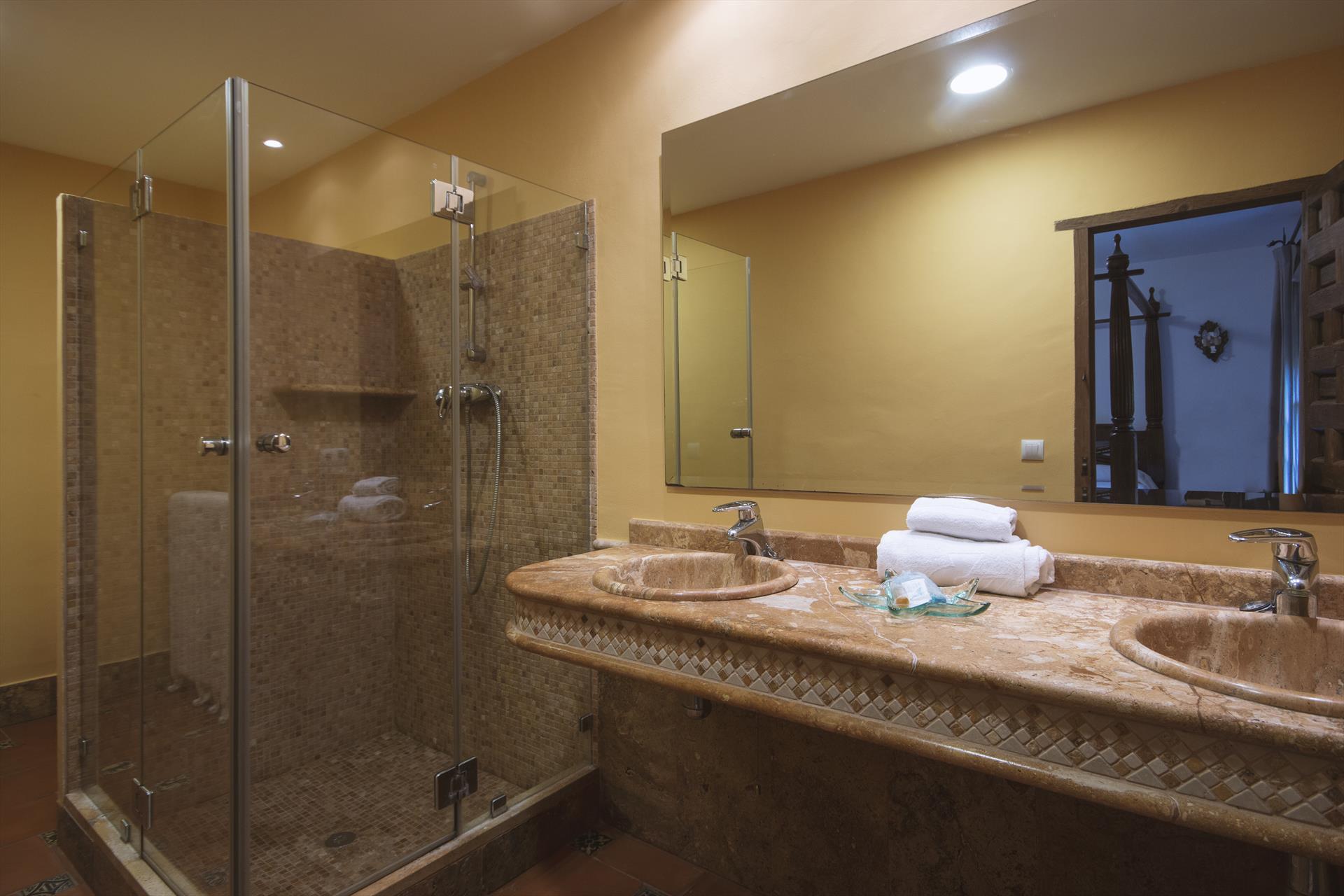 • en-suite bathroom with double washbasin, shower and toilet