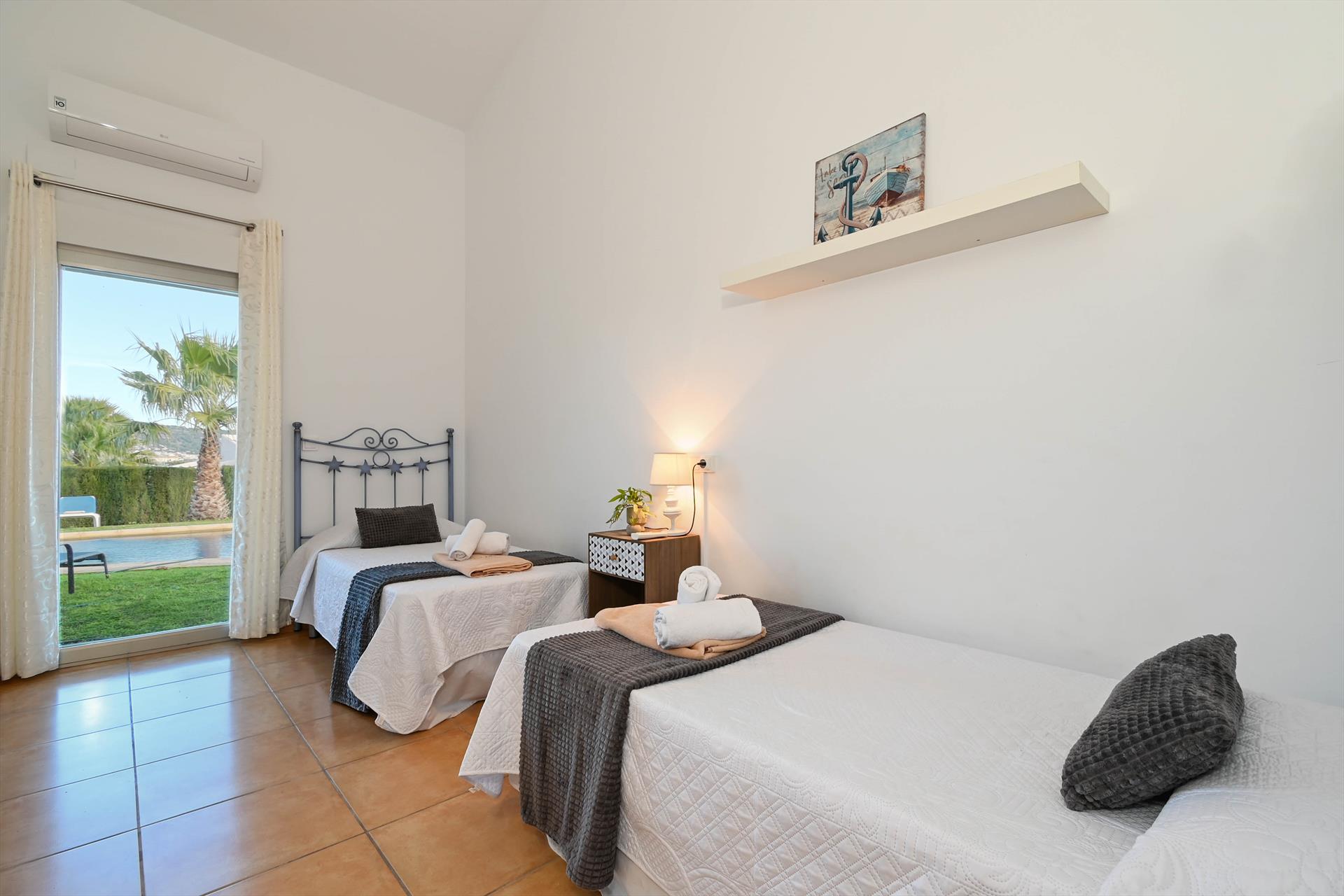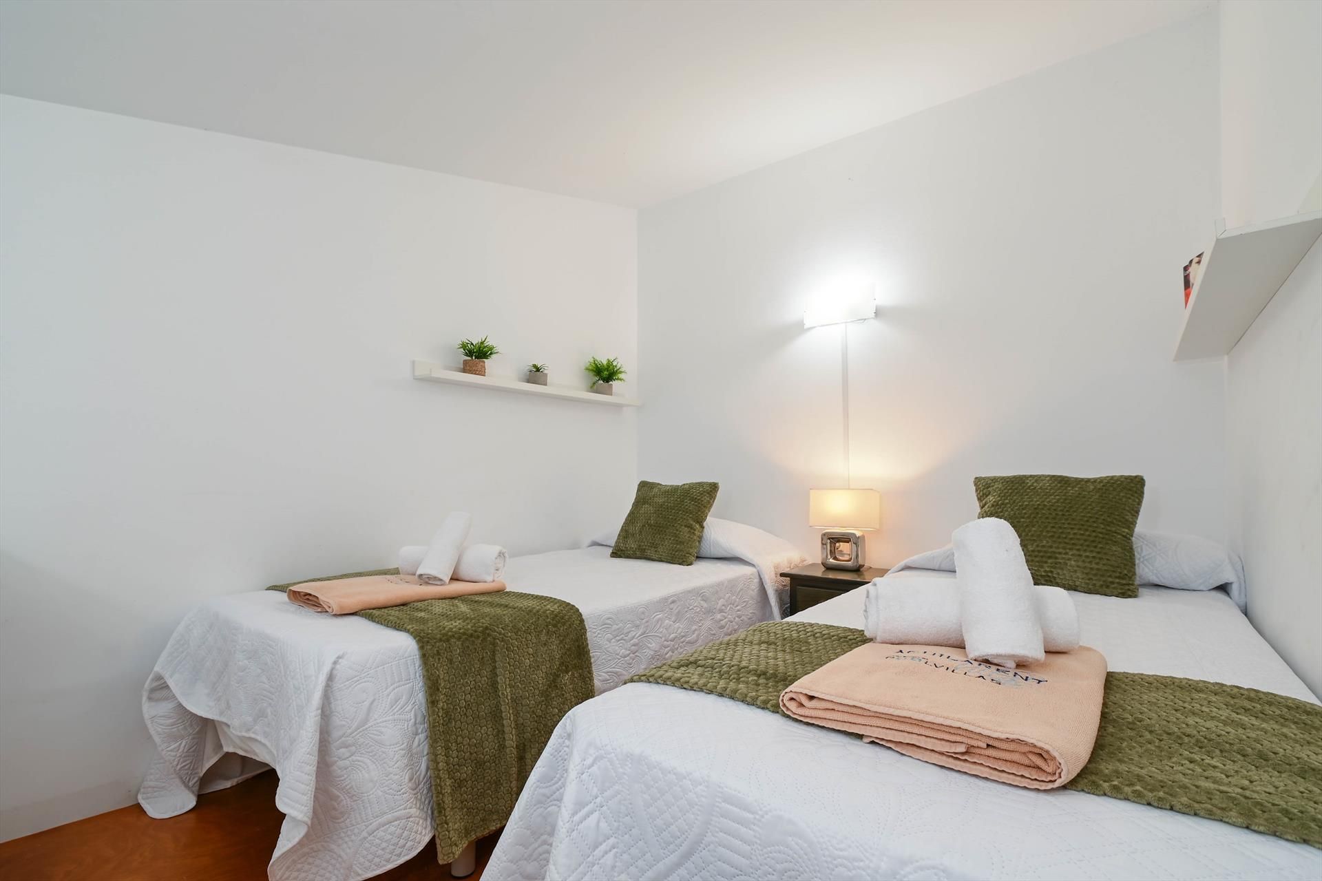 • bedroom with air conditioning and 2 single beds (measuring 200 by 90 cm)