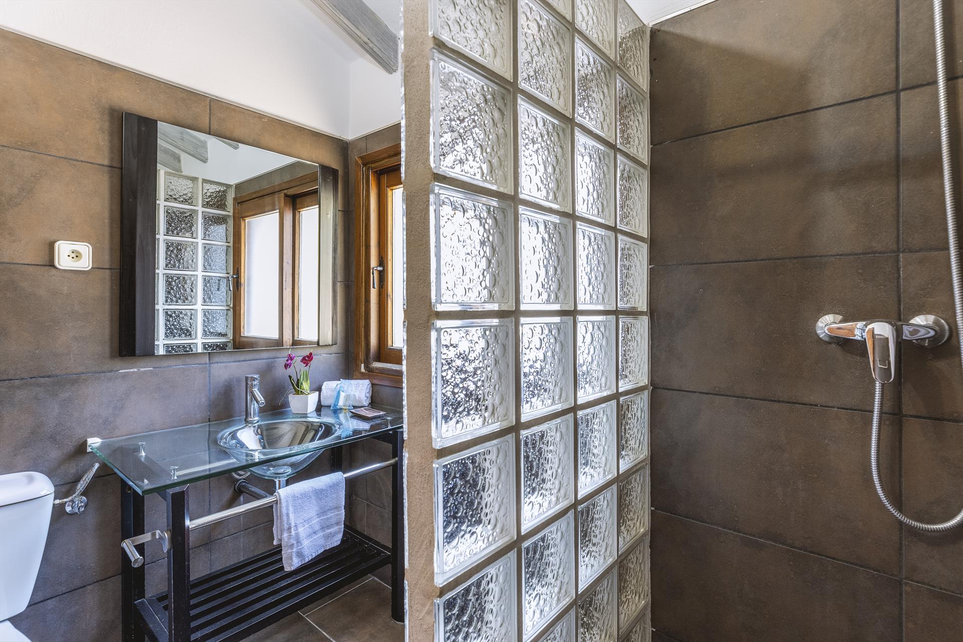 • en-suite bathroom with single washbasin, shower and toilet