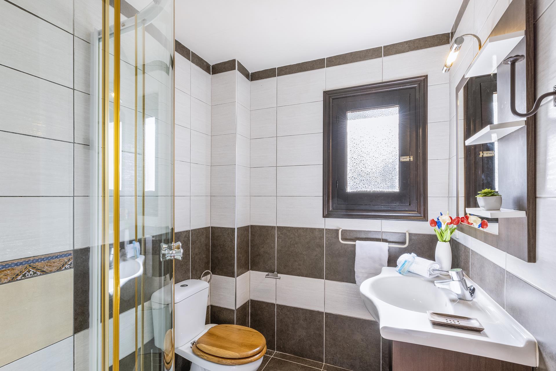 • bathroom with single washbasin, shower and toilet