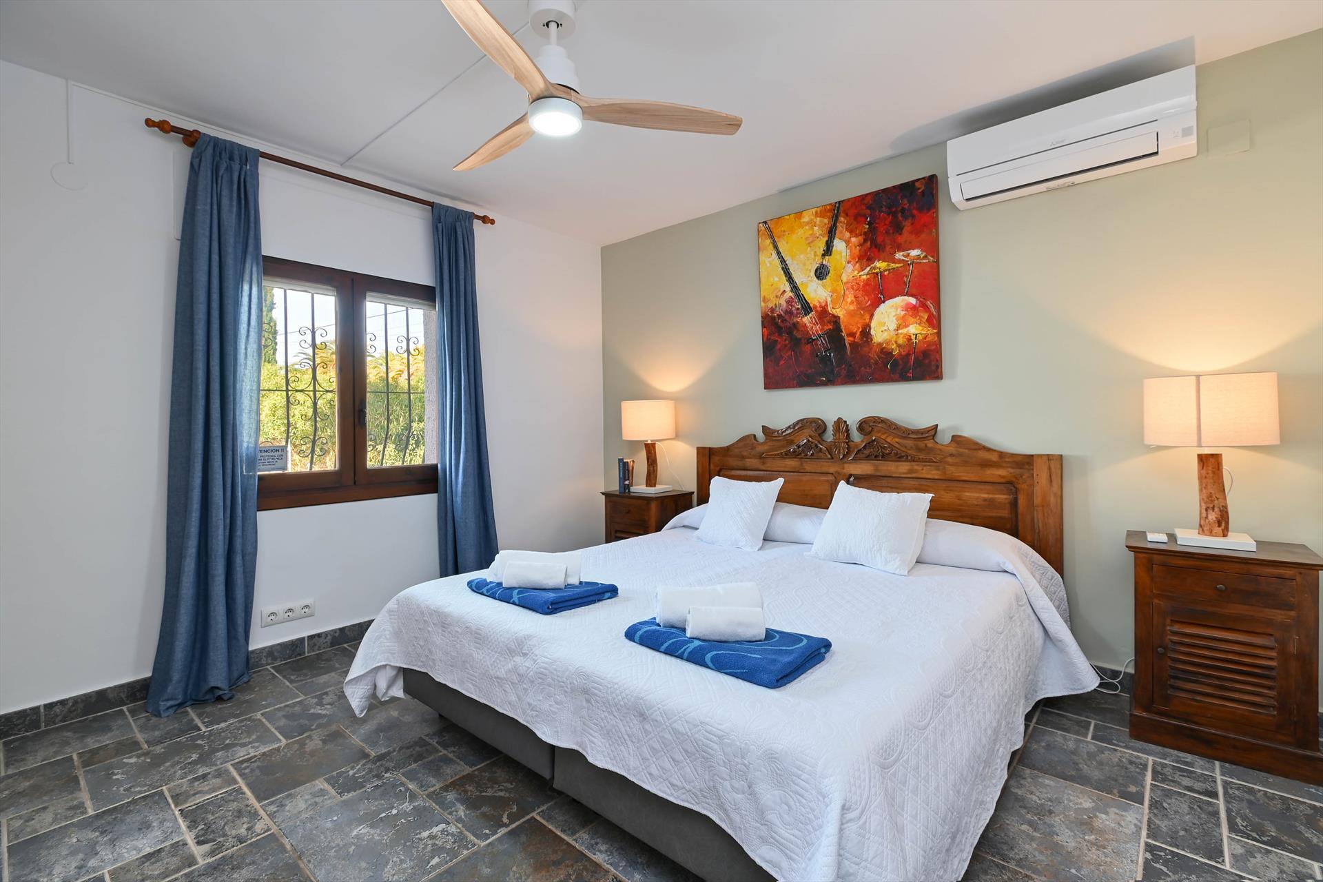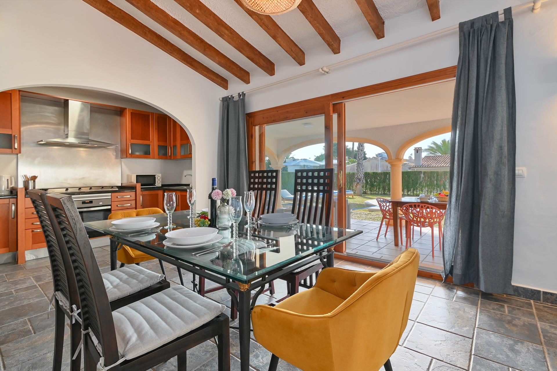 Beautiful and comfortable villa with private pool in Javea, on the Costa Blanca, Spain for 4 persons. The villa is situated in a coastal, hilly, wooded and residential area, close to restaurants and bars, supermarkets and a tennis court and at 2 km from Playa Ambolo, Javea beach. The villa has 2 bedrooms and 1 bathroom. The accommodation offers privacy, a wonderful lawned garden with gravel and trees and a large beautiful pool. Its comfort and the vicinity of the beach, places to shop, sports activities and places to go out make this a fine villa to celebrate your holidays with family or friends and even your pets.