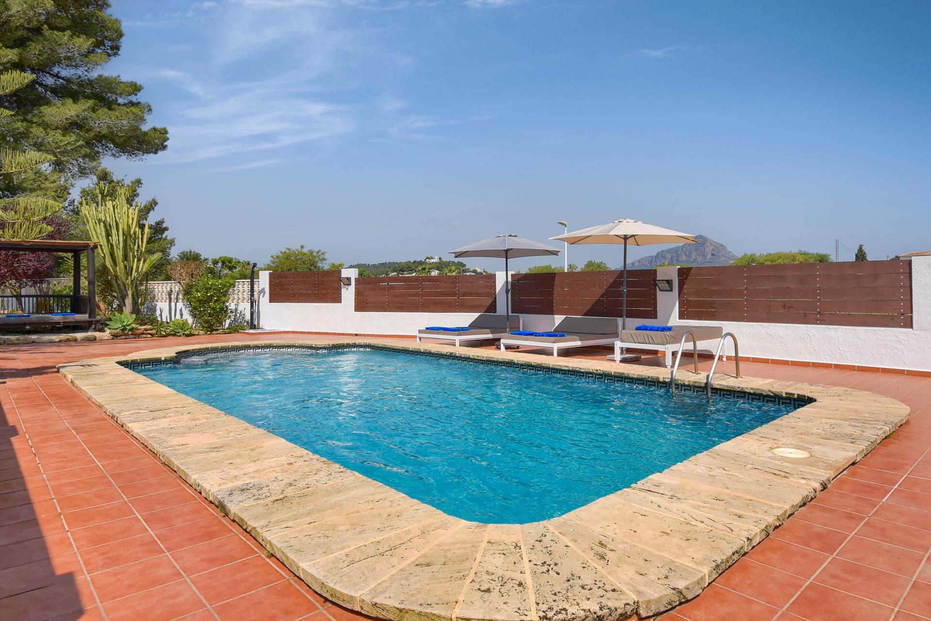 Large and comfortable villa with private pool in Javea, Costa Blanca, Spain for 8 persons. The house is situated in a wooded and residential beach area and at 2 km from El Arenal, Javea beach. The accommodation offers privacy, a garden with gravel and trees and a beautiful pool. Its comfort and the vicinity of the beach, sports activities, entertainment facilities, sights and culture make this a fine villa to spend your holidays in Spain with family or friends and even your pets.