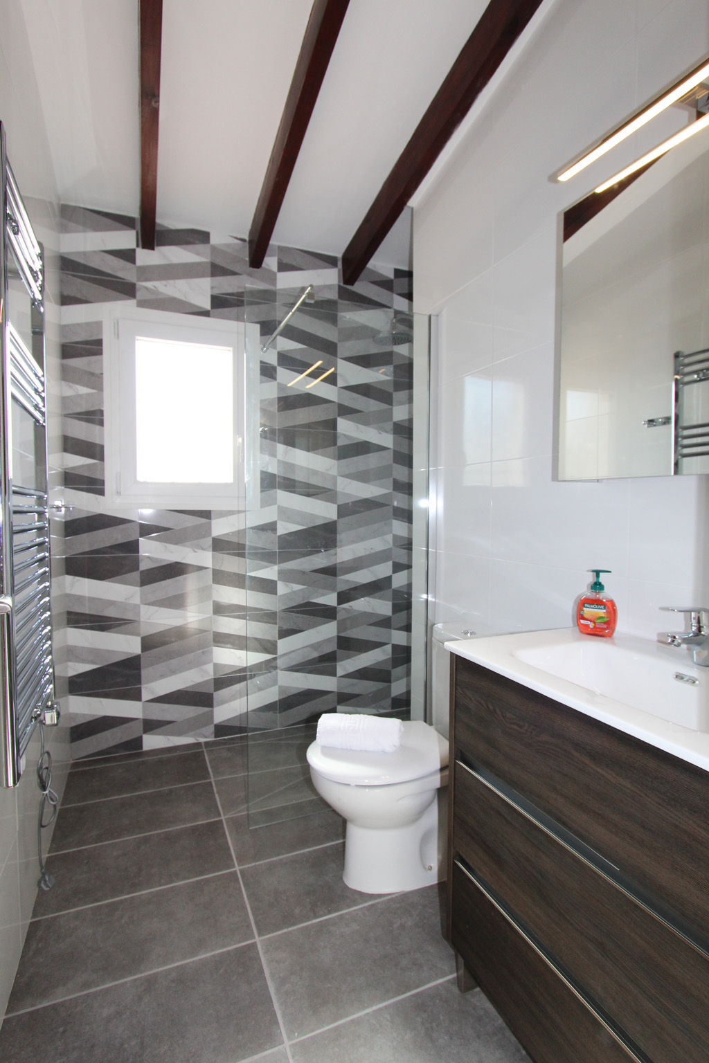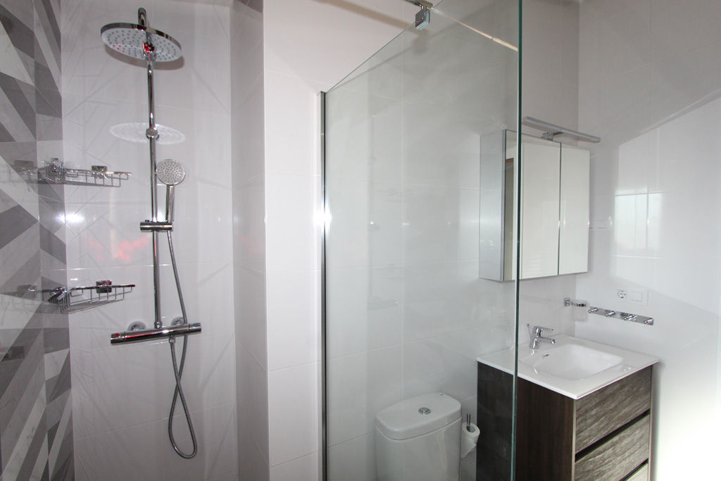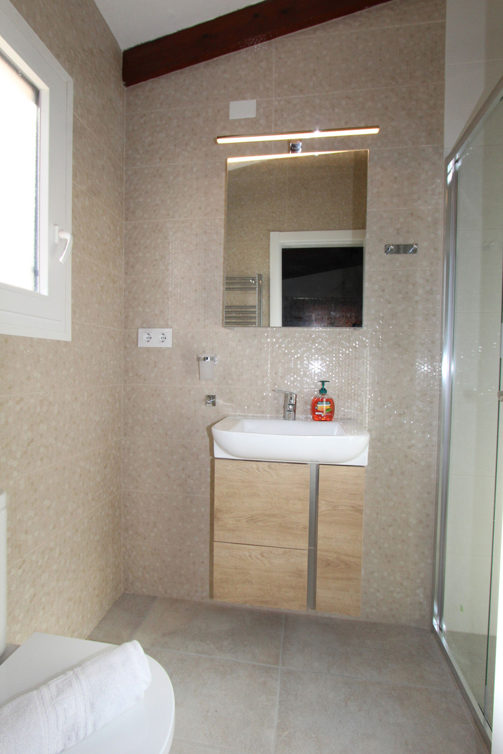 • bathroom with single washbasin, shower, bidet and toilet