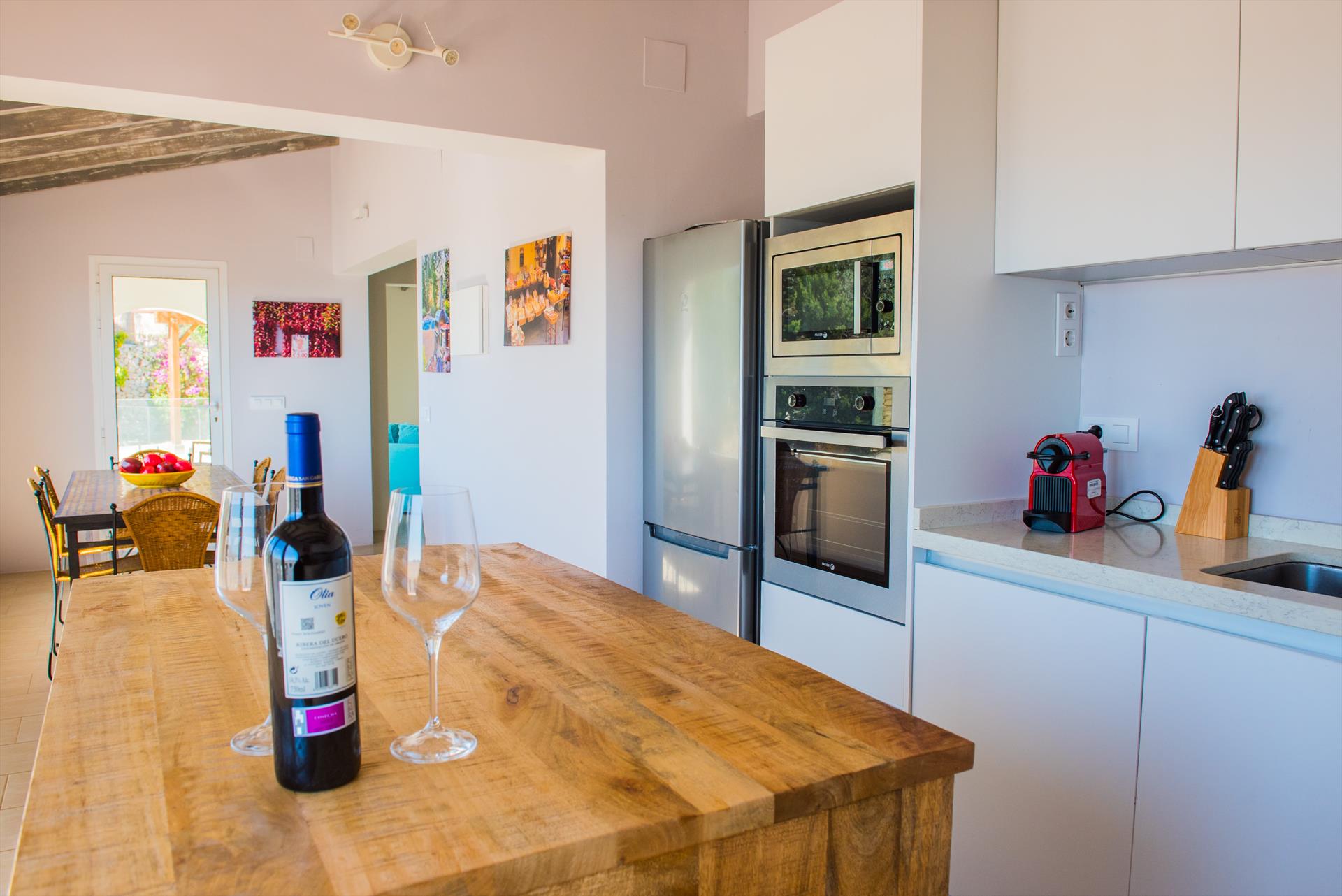 • open kitchen with electric hob, electric oven, microwave, dishwasher, refrigerator-freezer, coffee machine, electric kettle, mixer, toaster and juicer