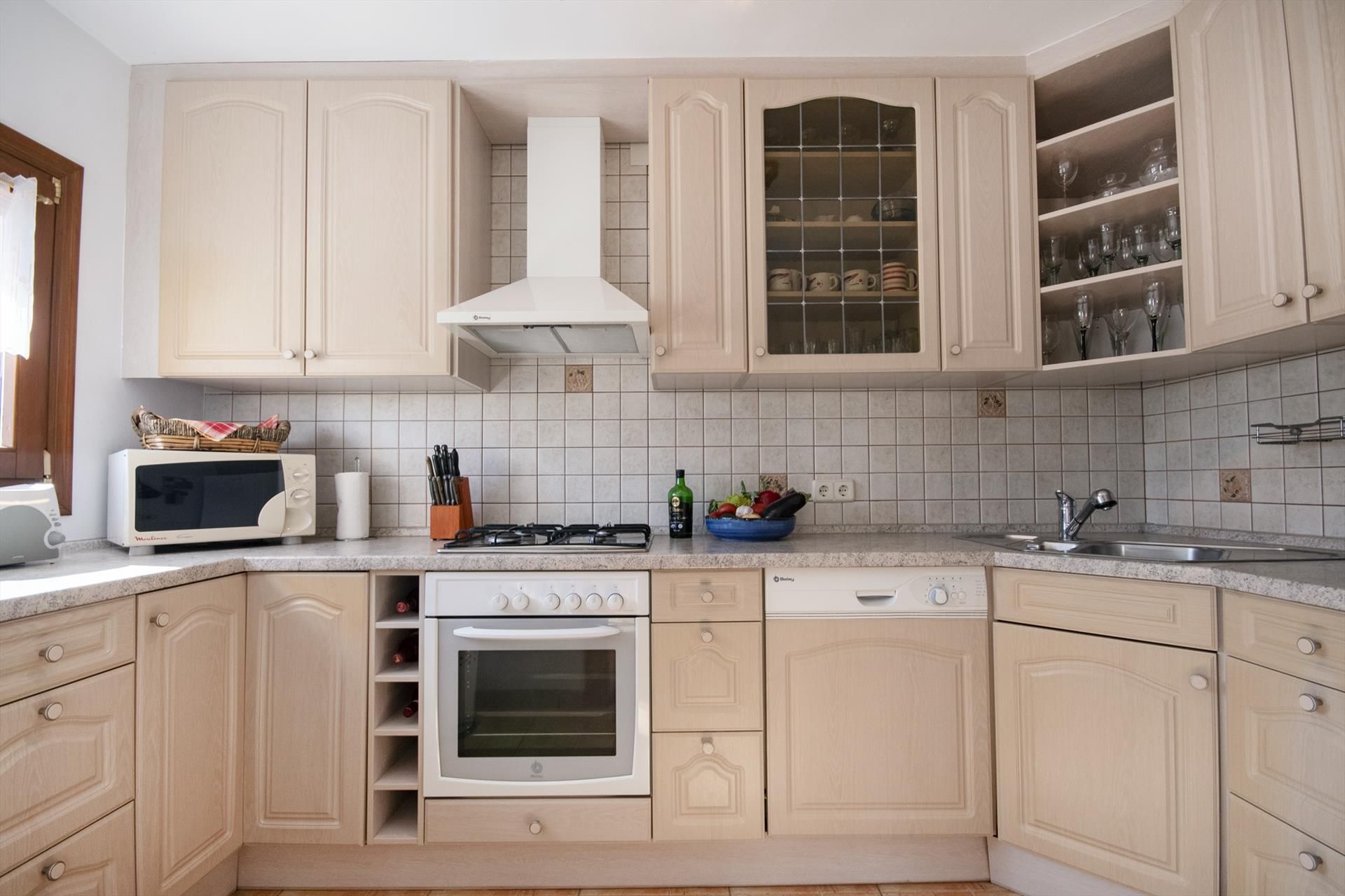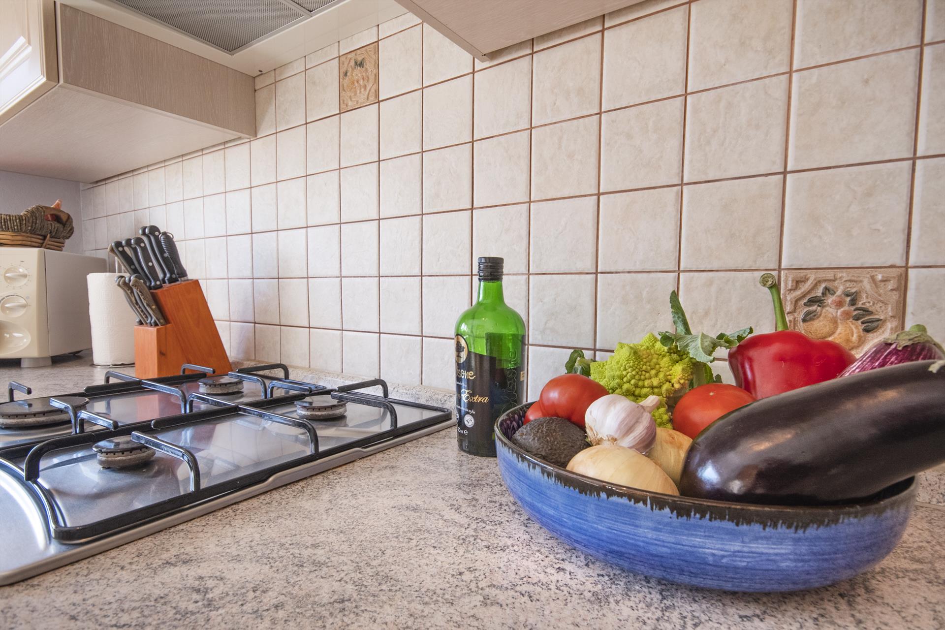 • cuisine avec plaque de cuisson au gaz, four électrique, micro-ondes, lave-vaisselle, réfrigérateur-congélateur, machine à café, bouilloire électrique, mixeur, grille-pain et presse-agrumes