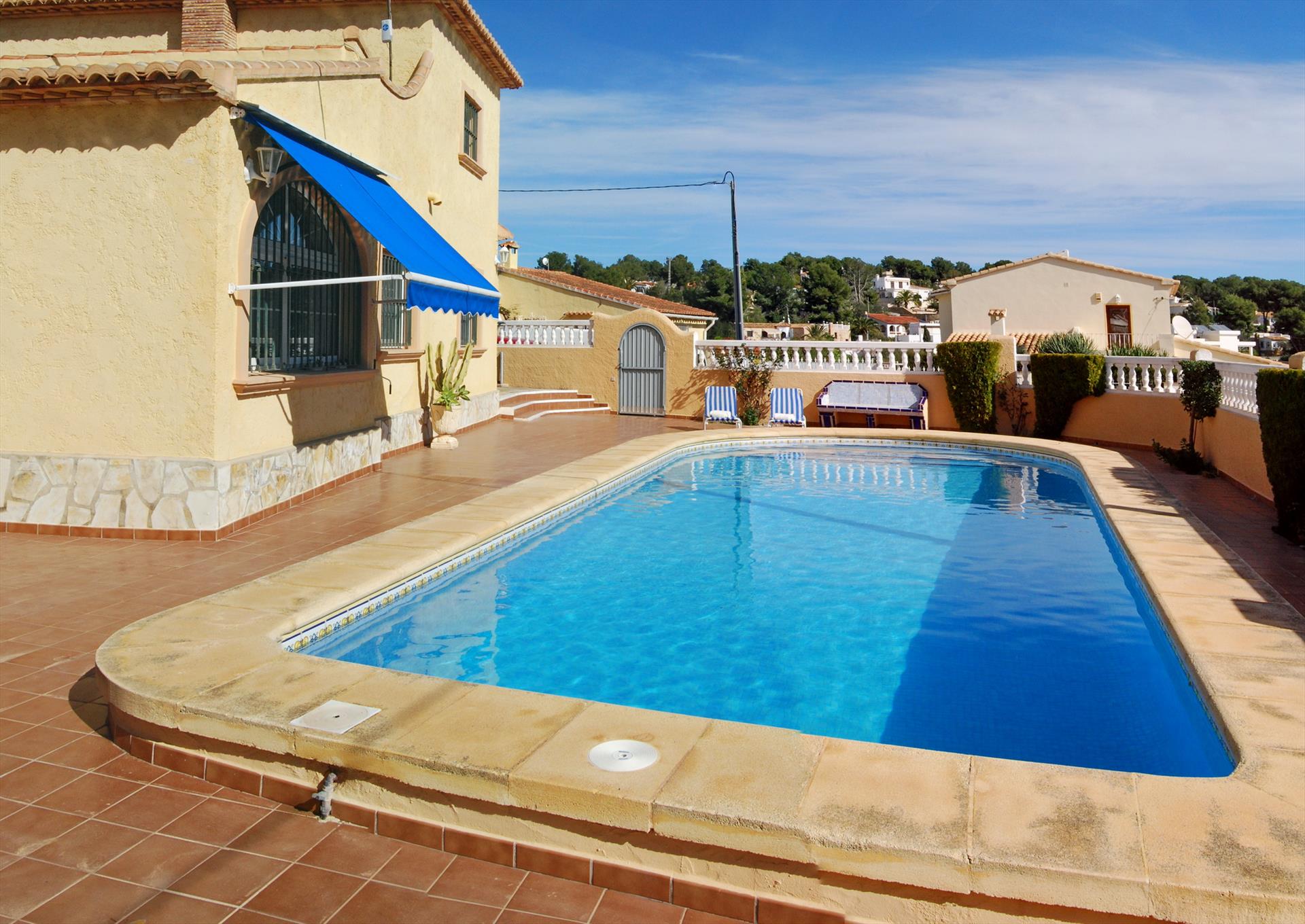 Superbe et confortable villa à Benissa, Costa Blanca, Espagne, avec piscine privée pour 6 personnes. La maison est située dans un quartier résidentiel en bord de mer et se trouve à 2 km de la plage de La Fustera.