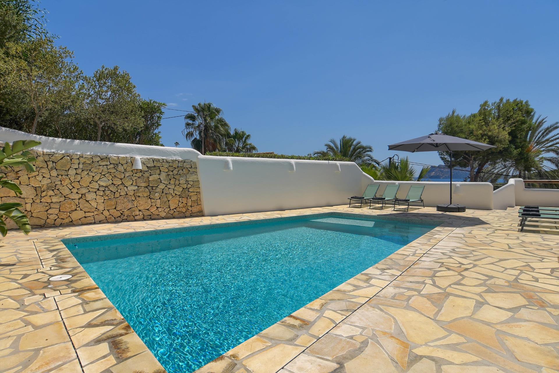 Belle location de vacances confortable avec piscine privée à Benissa, sur la Costa Blanca, Espagne pour 10 personnes. Le logement est situé dans une région balnéaire et résidentielle, près de restaurants et bars et de supermarchés, à 1 km de la plage de Cala Baladrar, à 5 km de Moraira et à 1 km de Mediterraneo.