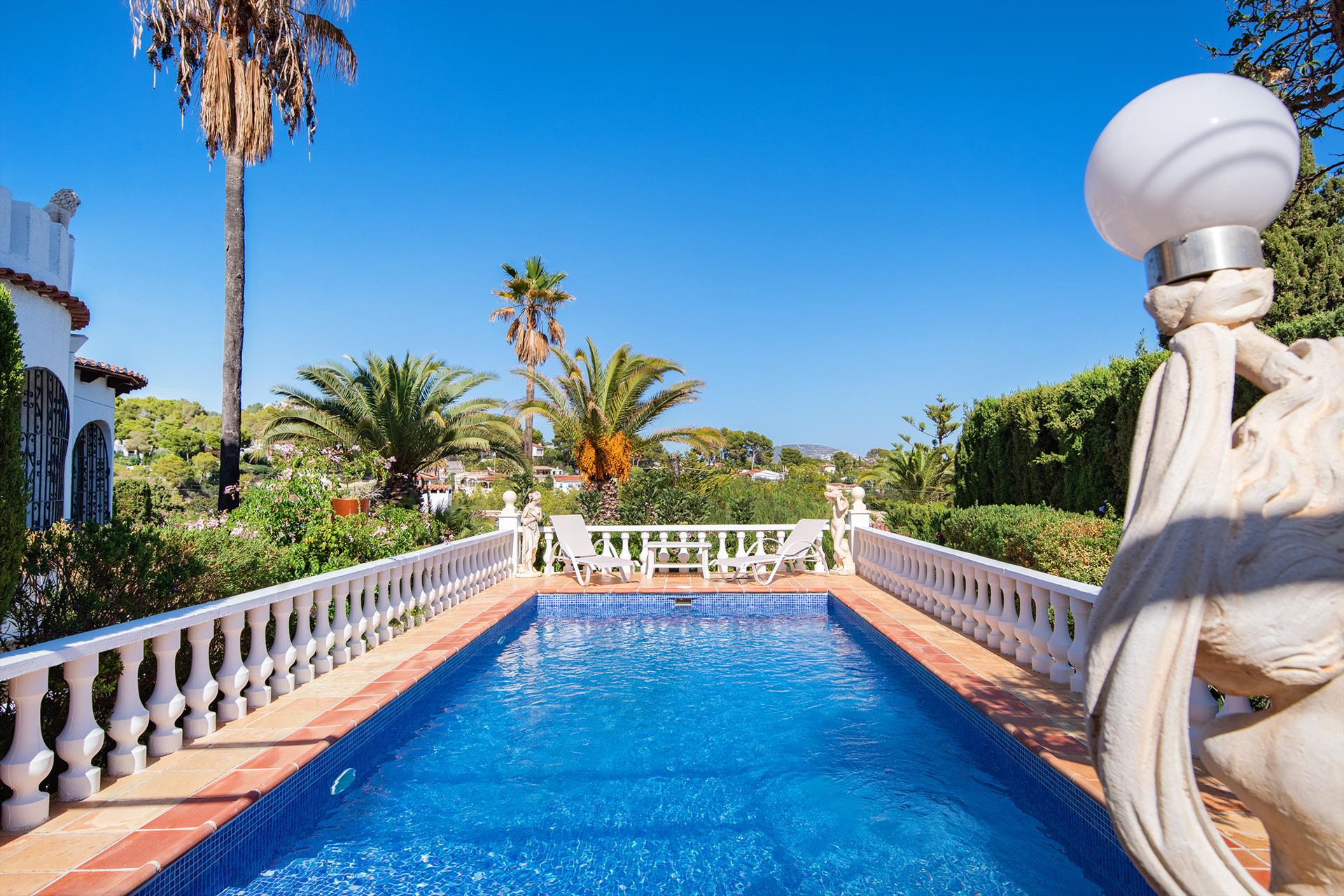 Villa classique et romantique avec piscine privative à Benissa, Costa Blanca, Espagne pour 6 personnes. La maison est située dans une zone côtière, vallonnée et résidentielle, à 2 km de la plage Cala La Llobella et à 5 km de Calpe.