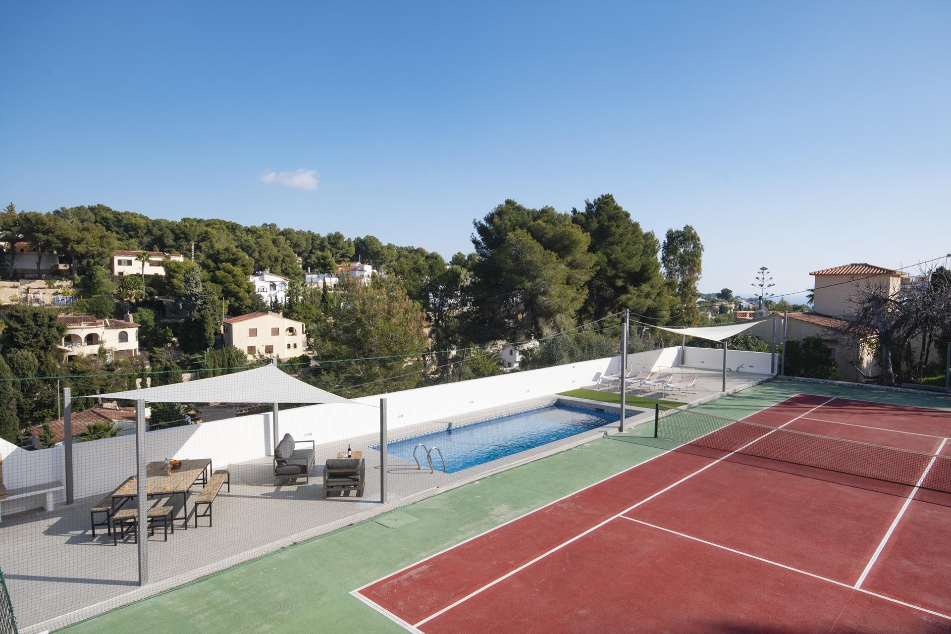 Villa moderne et ensoleillée avec piscine privée à Benissa, Costa Blanca, Espagne pour 6 personnes. La maison est située dans un quartier côtier et résidentiel, à proximité d'un court de tennis, à 2 km de la plage de Cala Abogat et à 5 km de Moraira.