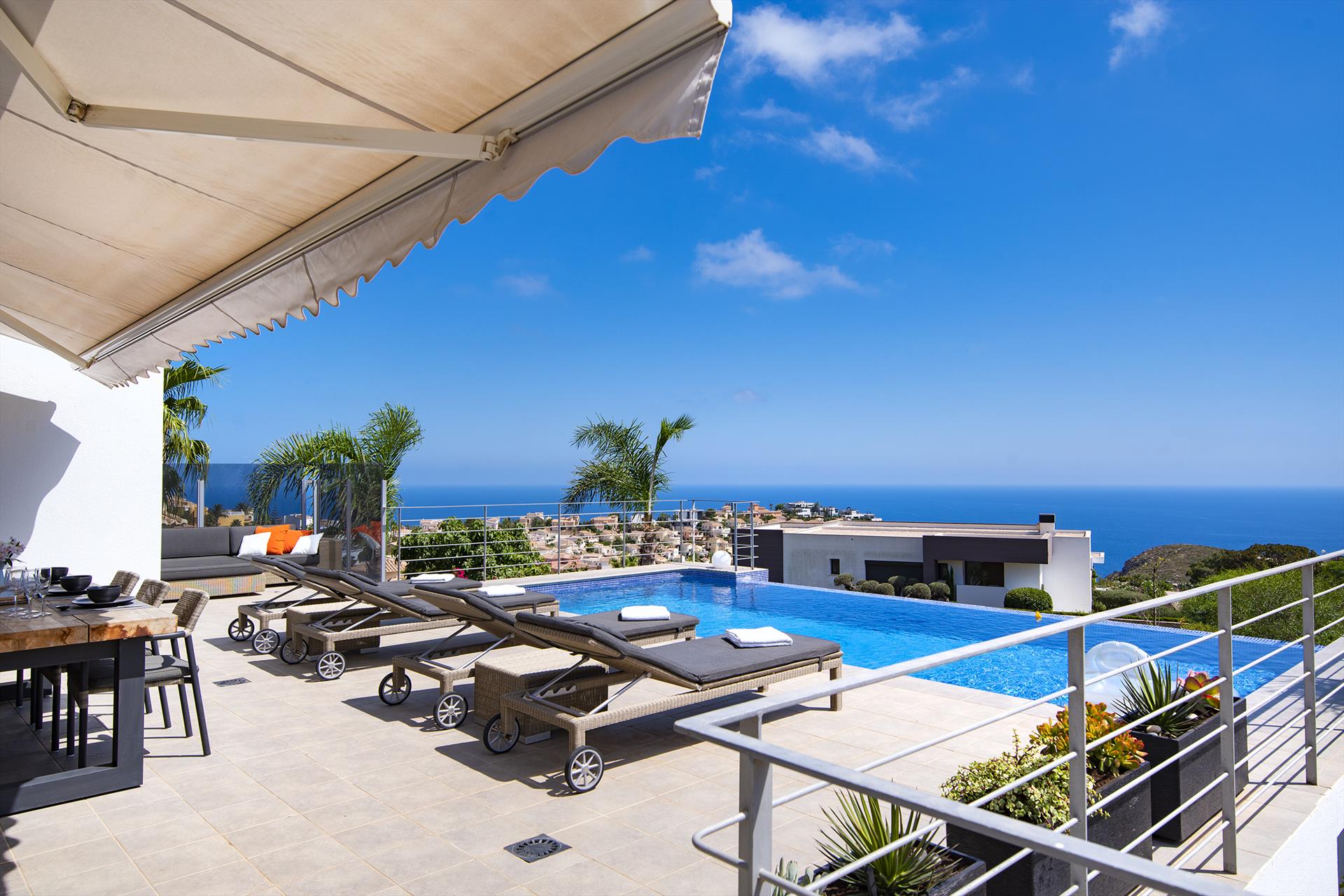 Villa moderne et confortable à Benitachell, Costa Blanca, Espagne, avec piscine privée pour 6 personnes. La maison est située dans un quartier côtier et résidentiel, à 3 km de la plage de Cala Moraig et à 5 km de Moraira.