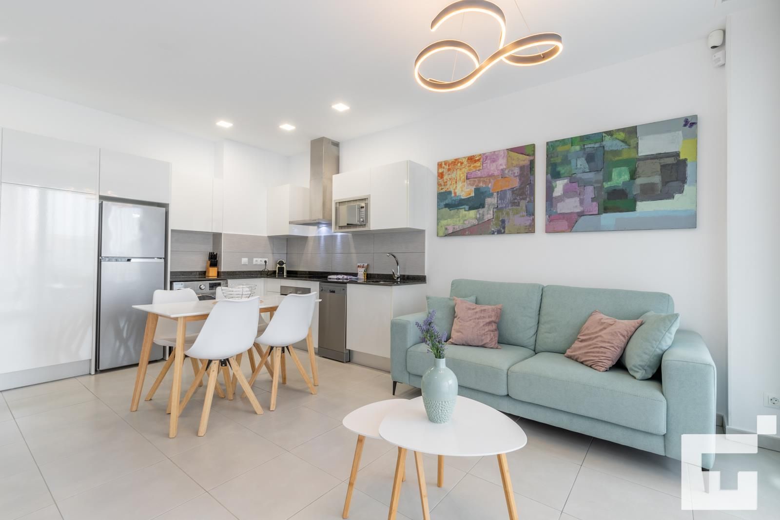 • cuisine ouverte avec plaques de cuisson électriques, four électrique, micro-ondes, lave-vaisselle, réfrigérateur, congélateur, machine à café, mixeur, grille-pain et presse-agrumes