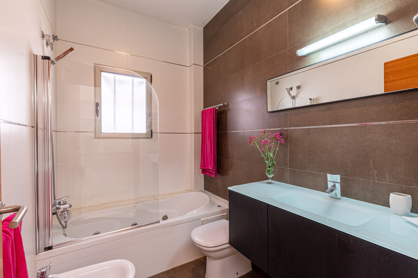 • salle de bain avec douche, bidet et toilette