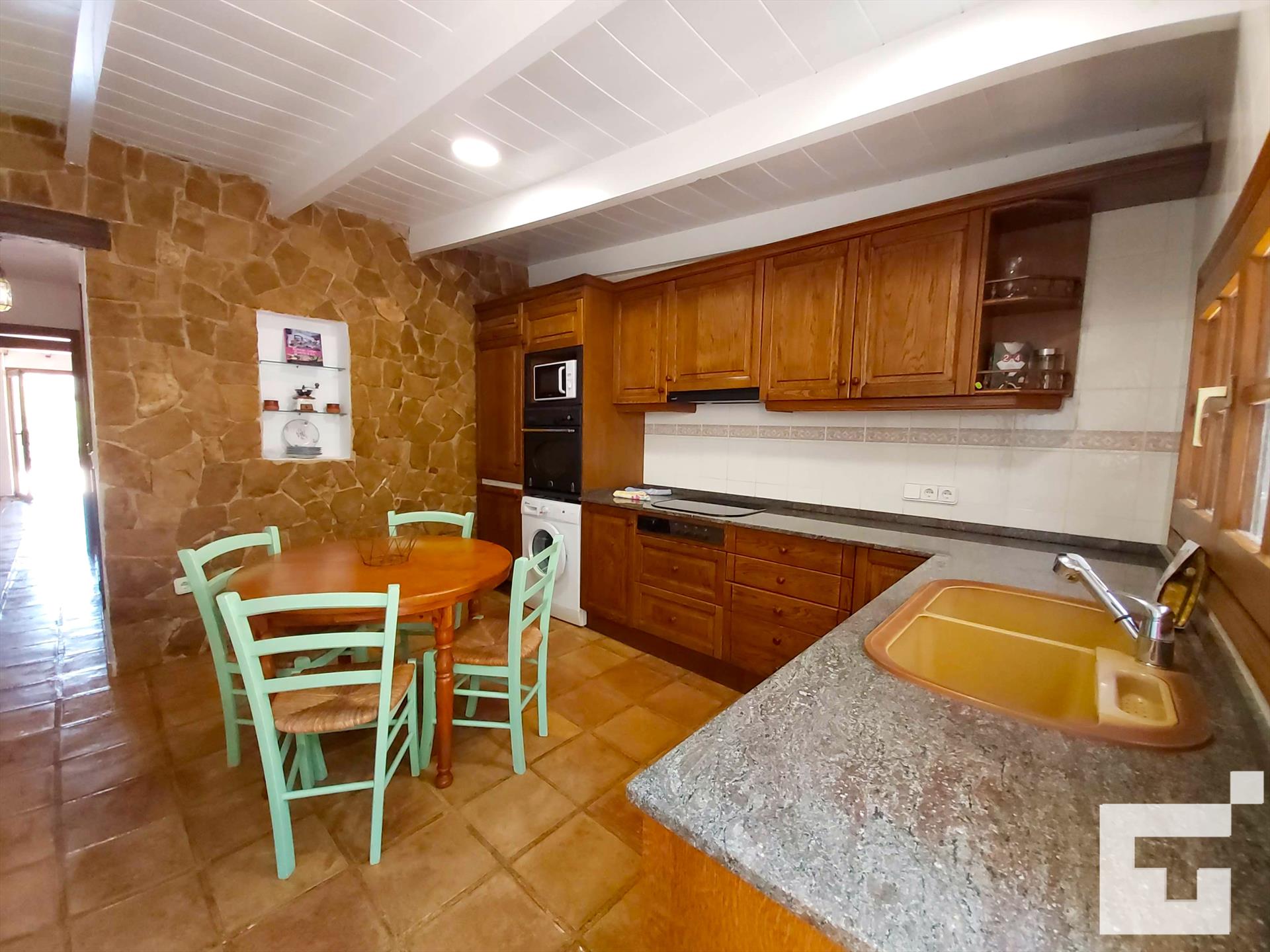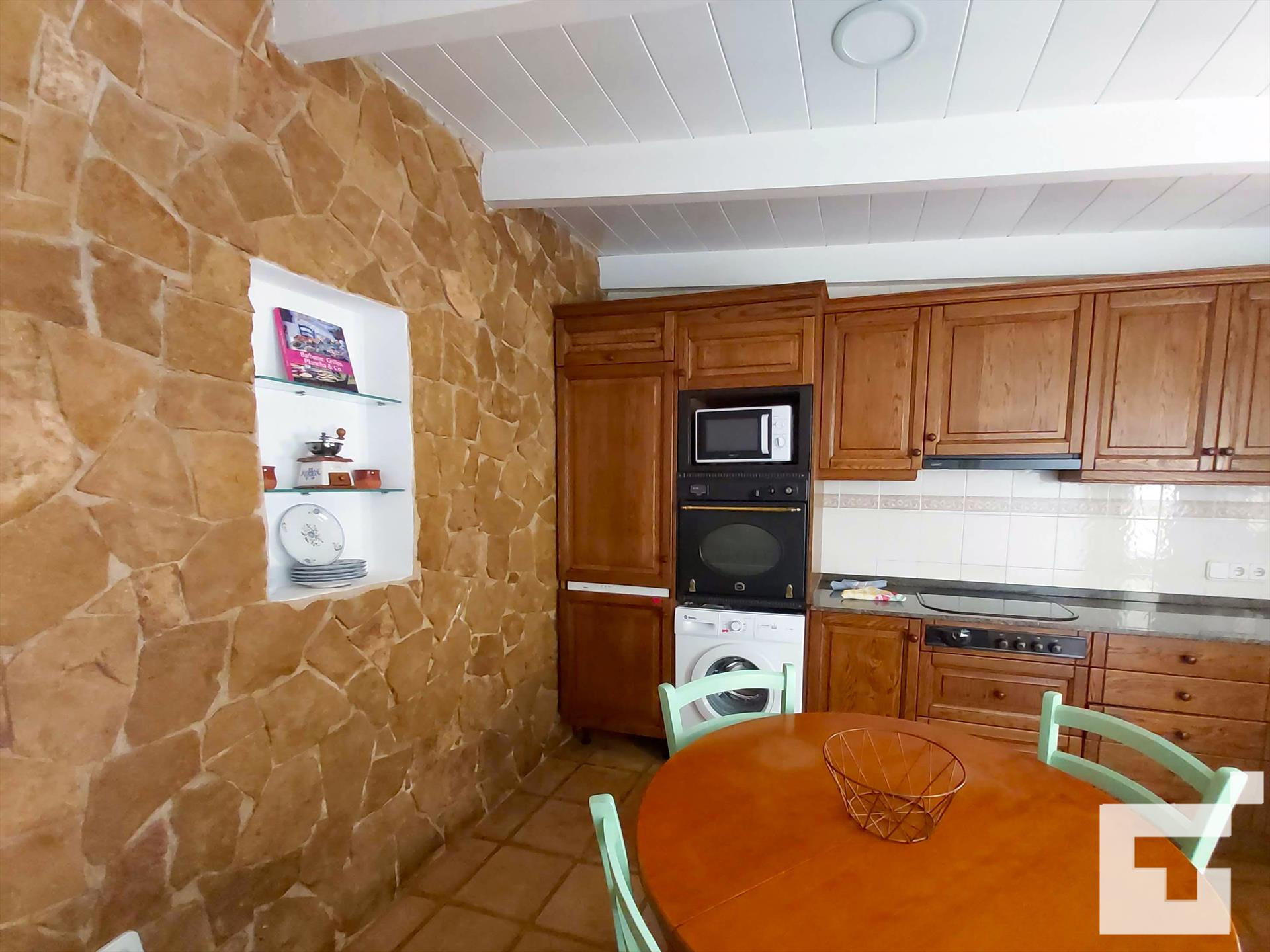 • cuisine avec plaque de cuisson électrique, four électrique, micro-ondes, lave-vaisselle, réfrigérateur, congélateur, machine à café, mixeur, grille-pain et extracteur de jus