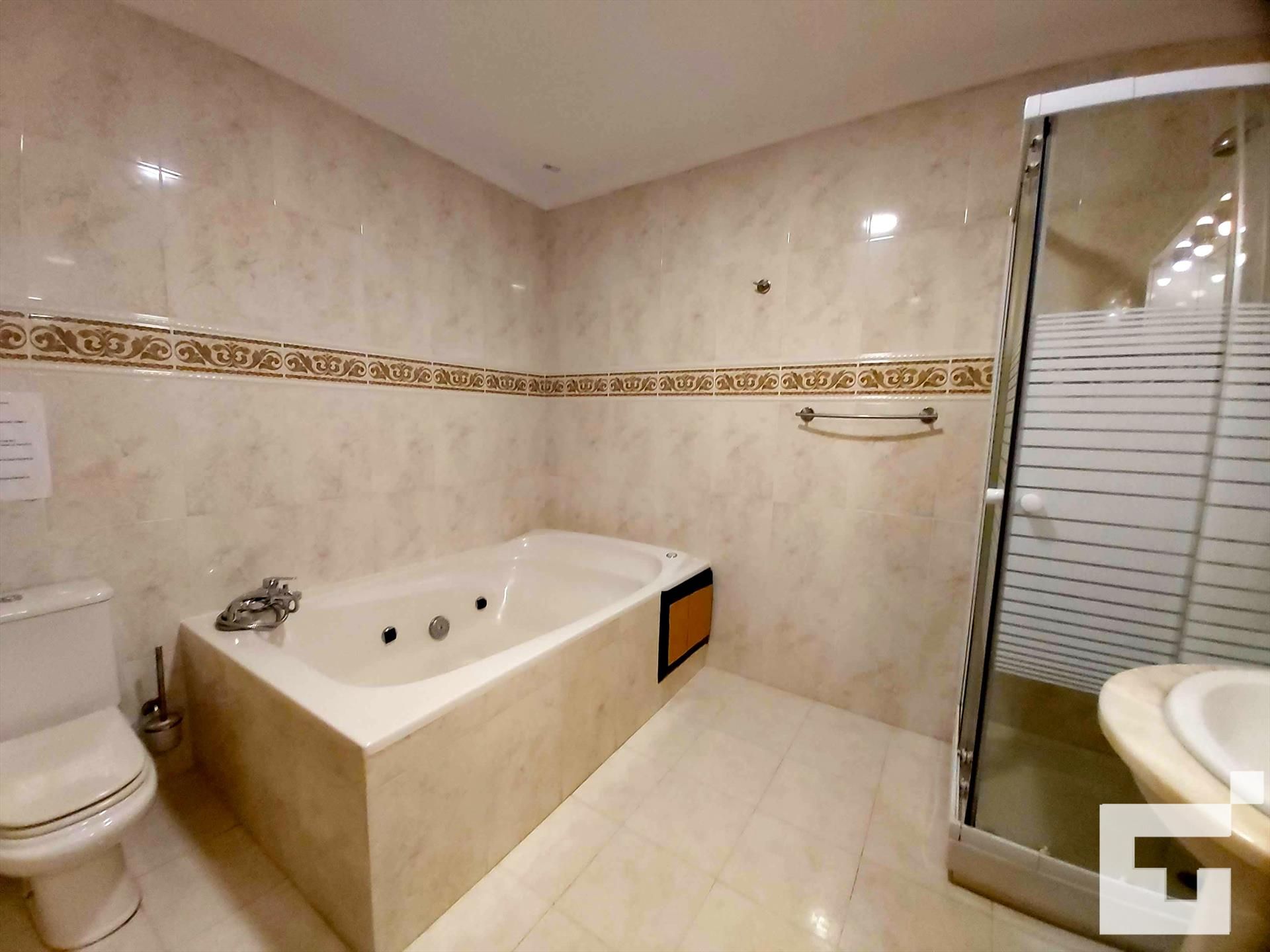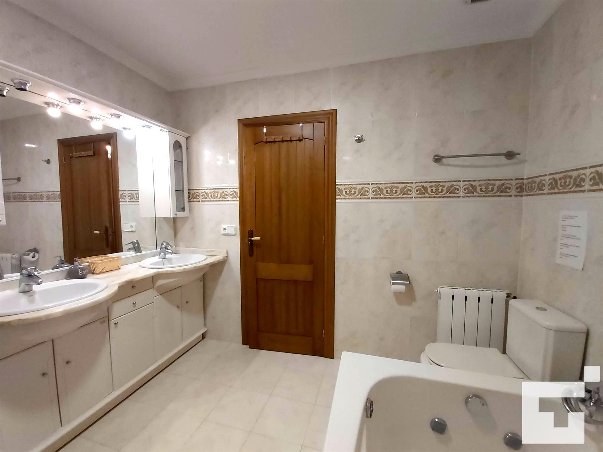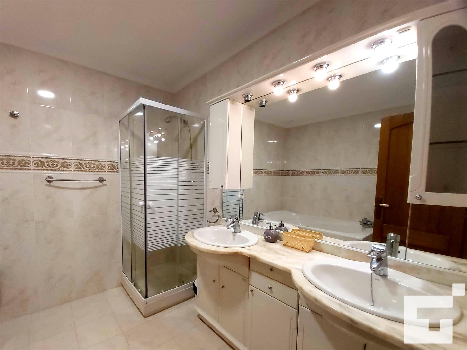 • salle de bains avec double lavabo, baignoire, douche et toilettes