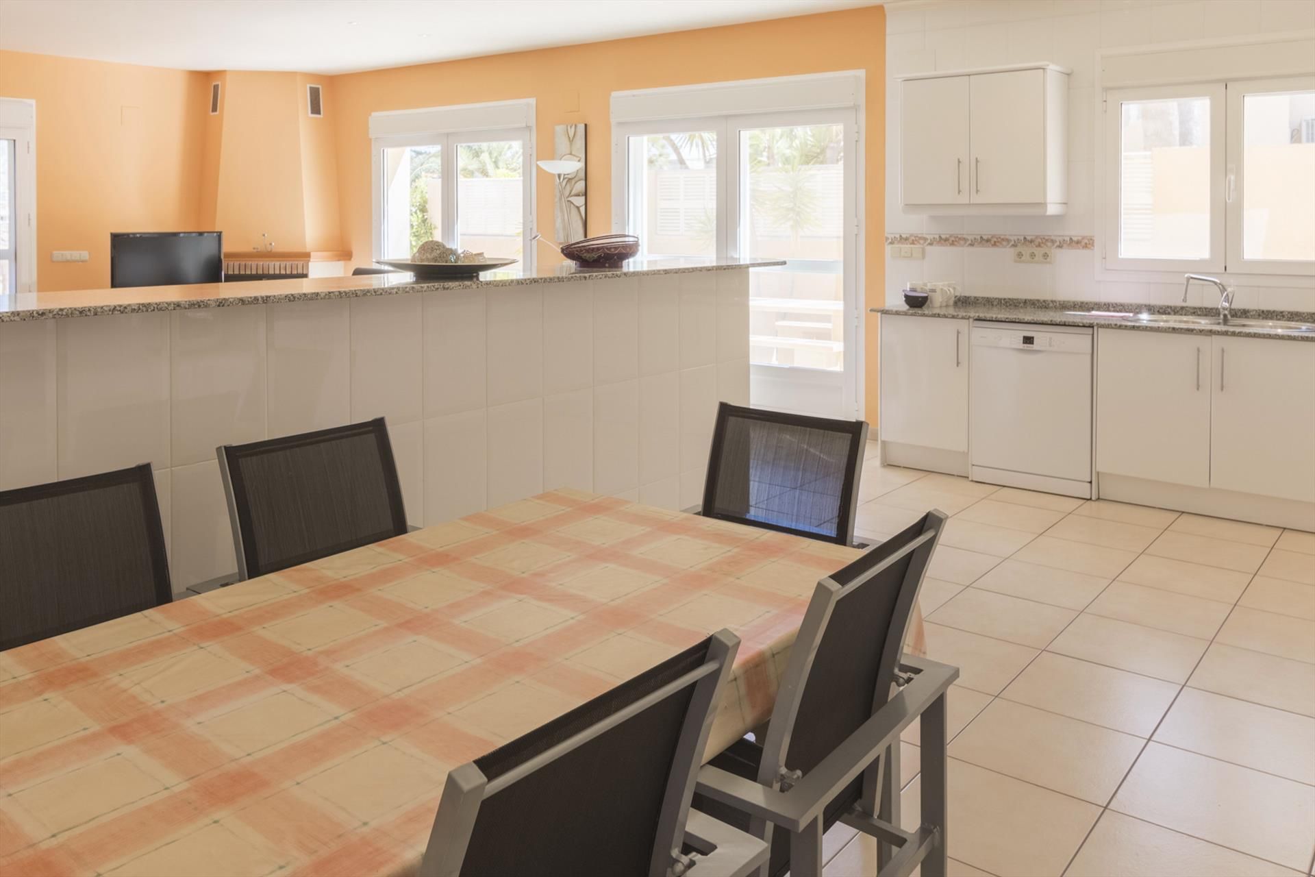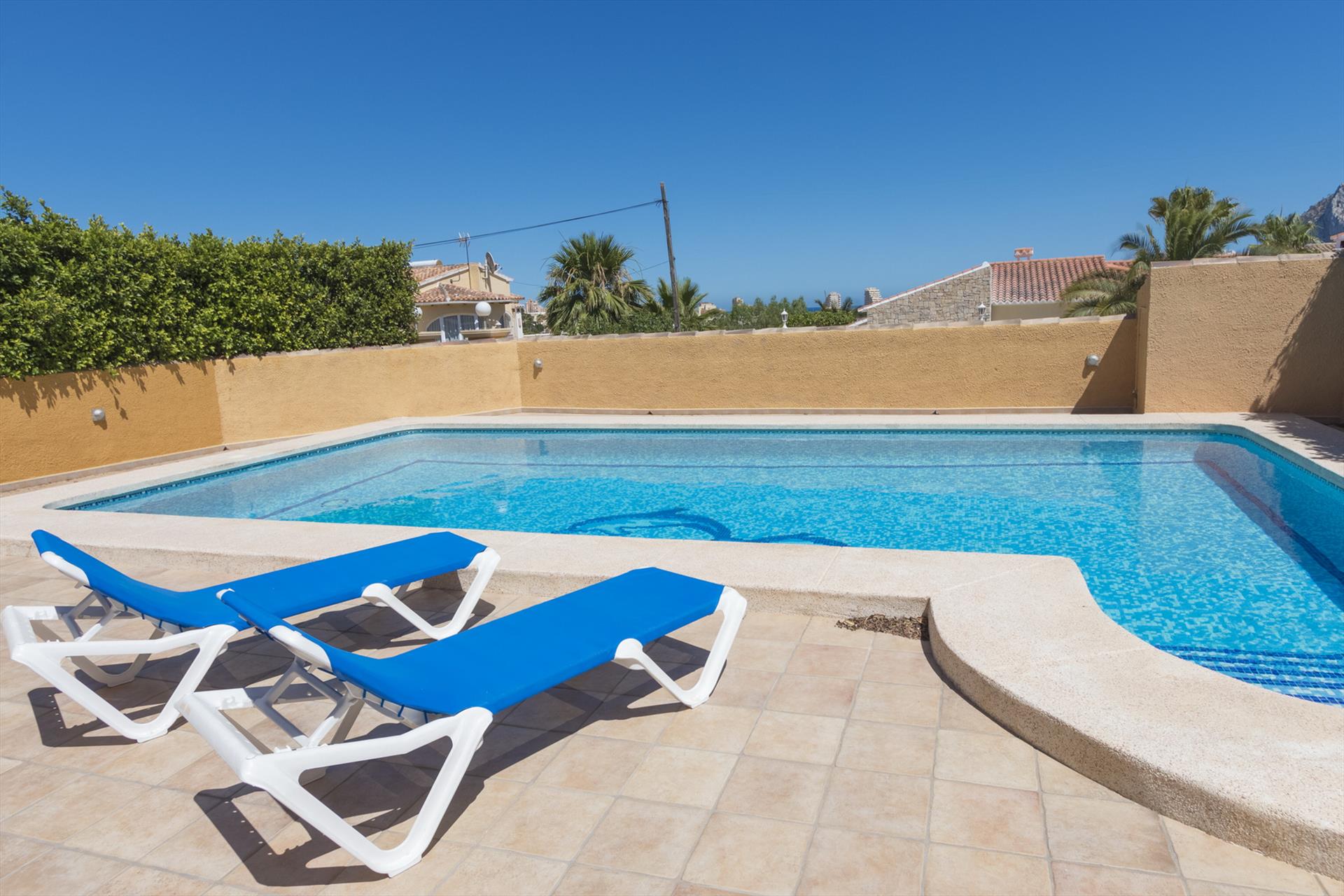 Grande et attrayante villa avec piscine privée à Calpe, Costa Blanca, Espagne, pour 6 personnes. La maison est située dans un quartier résidentiel près de la plage, à proximité de restaurants et de bars, et à 2 km de la plage Arenal-Bol, Calpe.