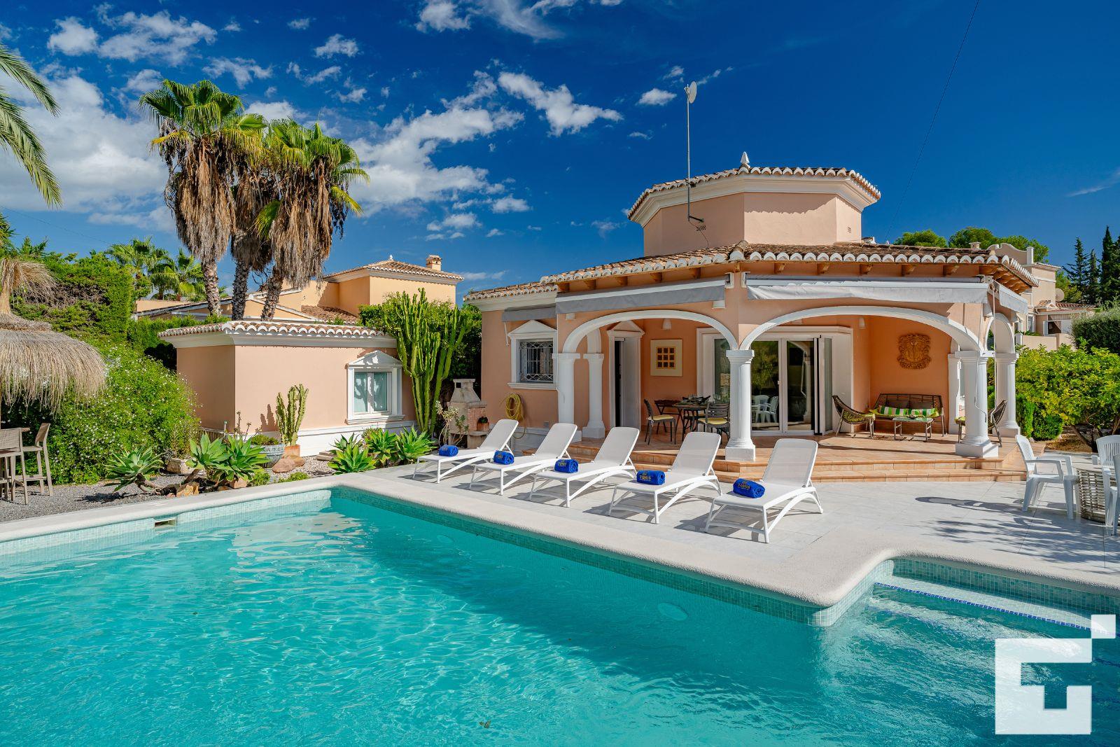 Villa merveilleuse et agréable avec piscine privée à Calpe, Costa Blanca, Espagne, pour 6 personnes. La maison est située dans un quartier résidentiel et se trouve à 3 km de la plage de Playa Levante.