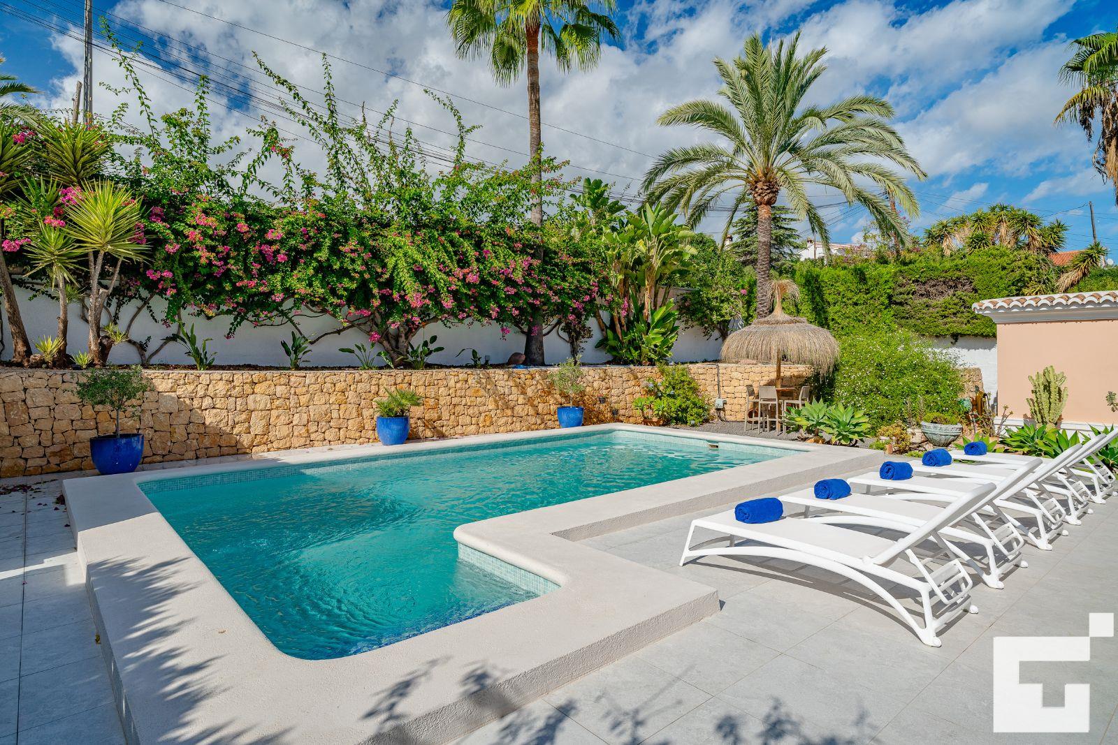 La maison dispose de 3 chambres et de 2 salles de bains. L'hébergement offre beaucoup d'intimité, un magnifique jardin avec pelouse, gravier et arbres, une superbe piscine ainsi qu'une vue sur la vallée et les montagnes. Son confort et la proximité de la plage, des lieux de shopping, des activités sportives et des lieux de sortie en font une villa idéale pour passer vos vacances en Espagne en famille ou entre amis.