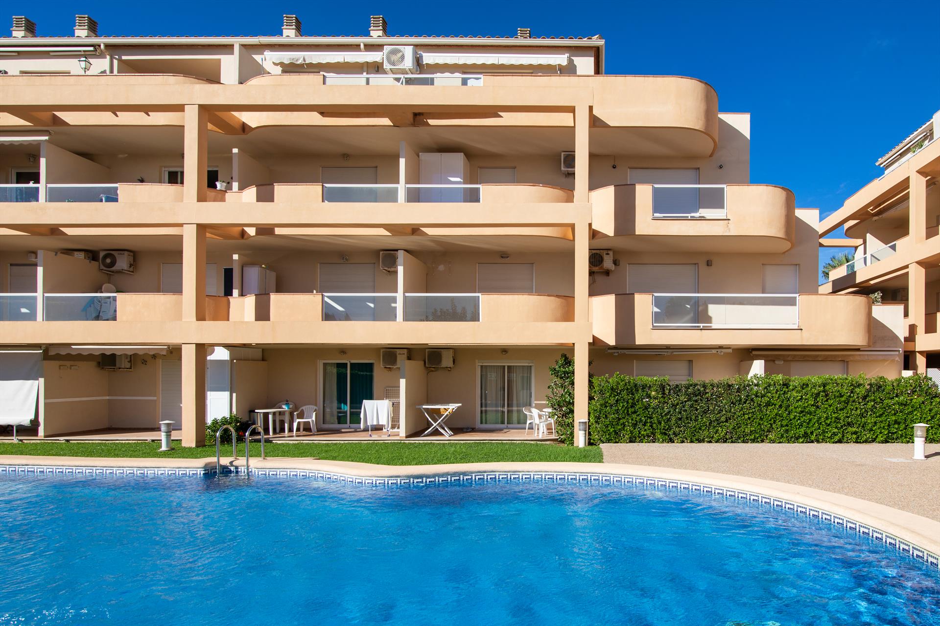 Extérieur : Salon de jardin et transats (pas nécessairement disponibles dans les appartements et maisons de ville)