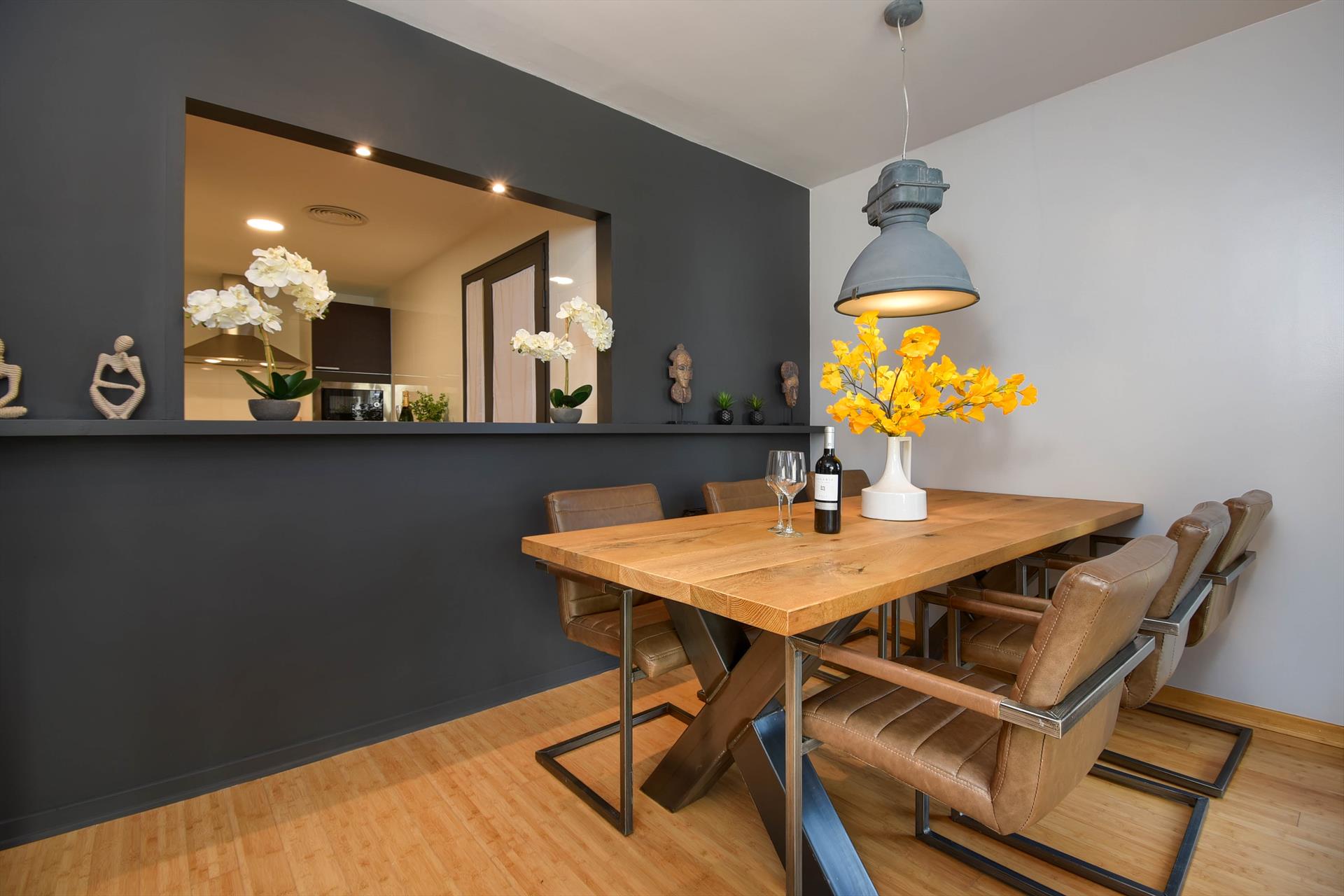 • cuisine à manger avec cuisinière à induction, four électrique, four à micro-ondes, lave-vaisselle, réfrigérateur-congélateur, cafetière électrique, bouilloire, mixeur, grille-pain et presse-citron