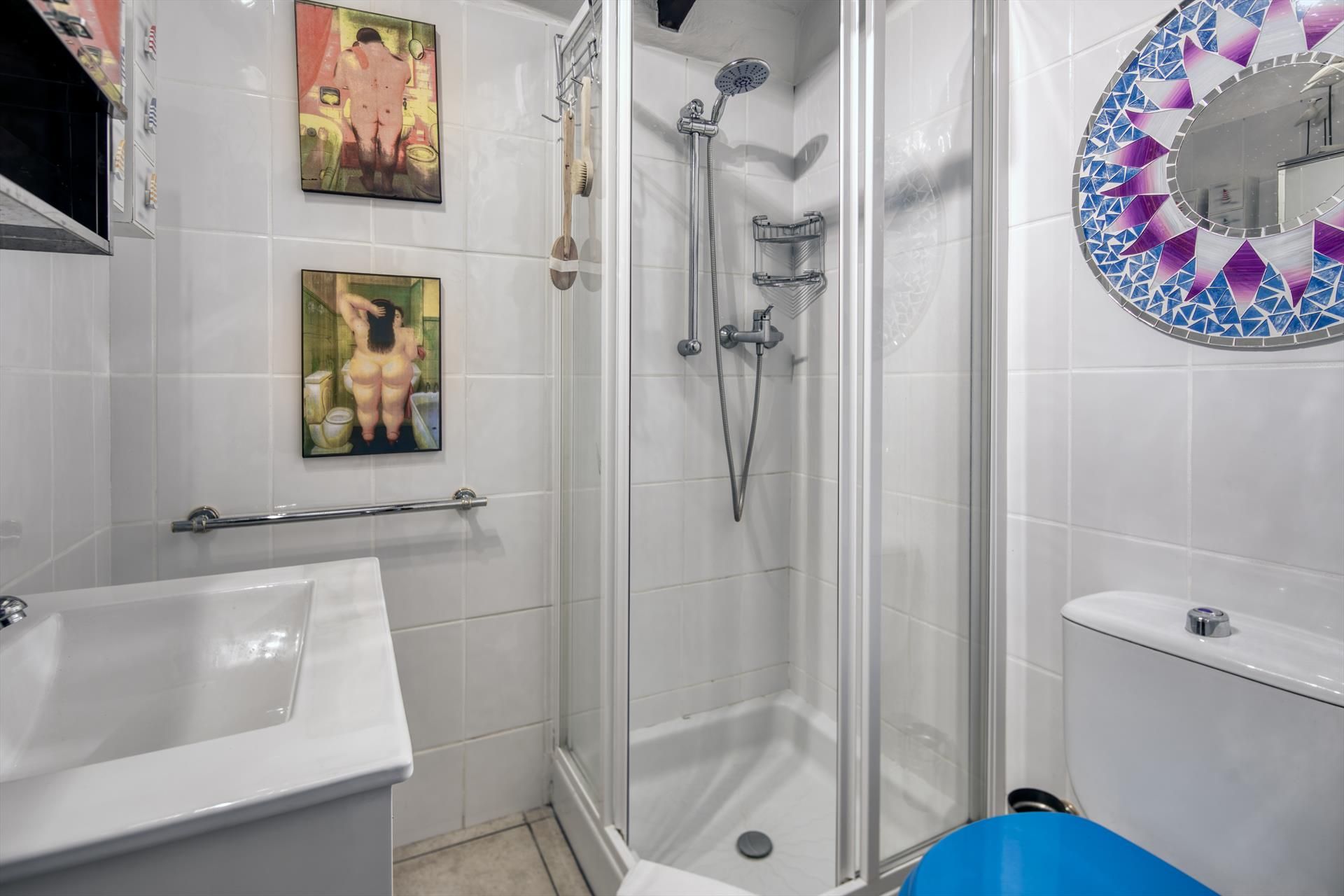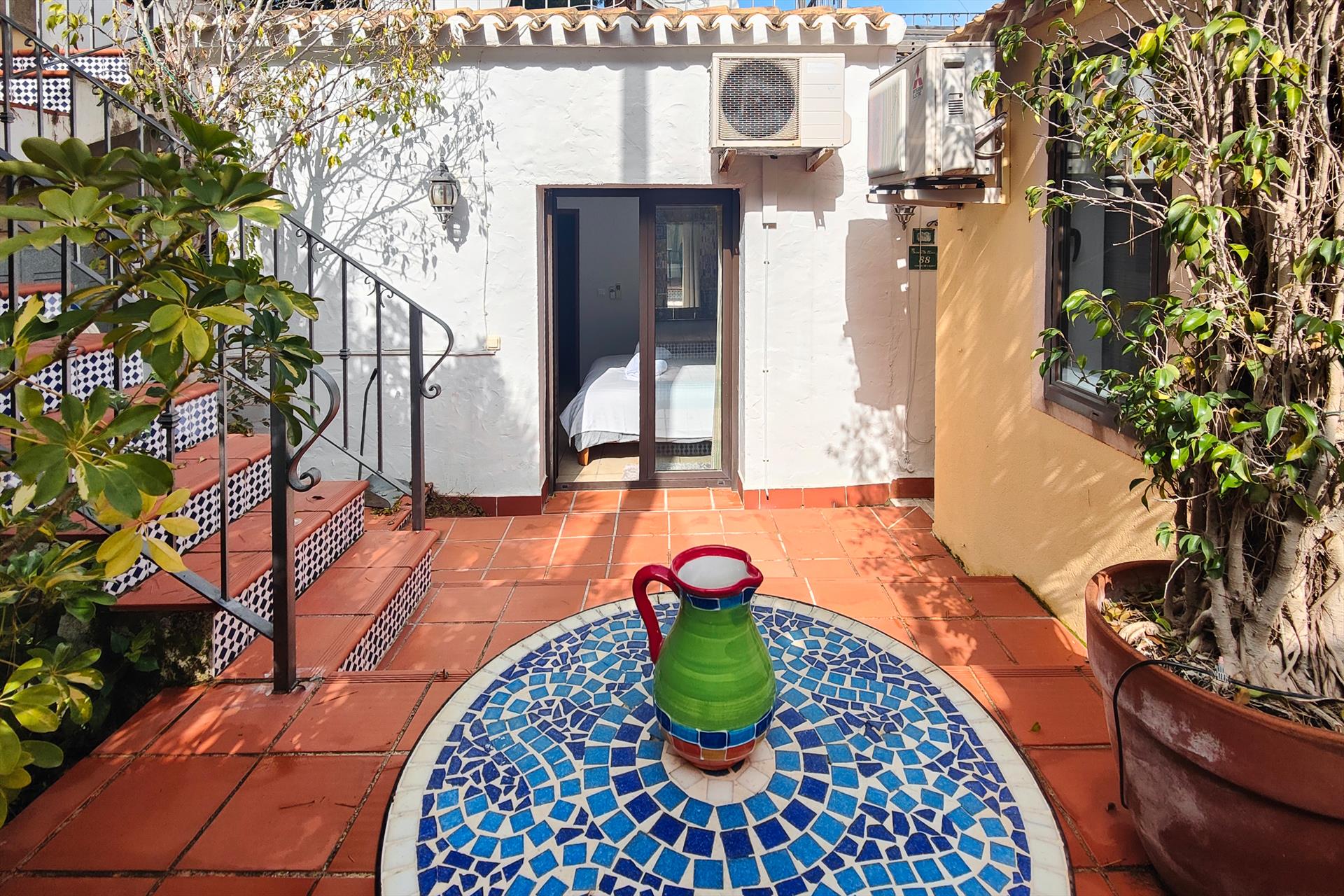 Intérieur : Réfrigérateur, plaque de cuisson et four ou grill électrique, cafetière, grille-pain, bouilloire, fer et table à repasser, mixeur.