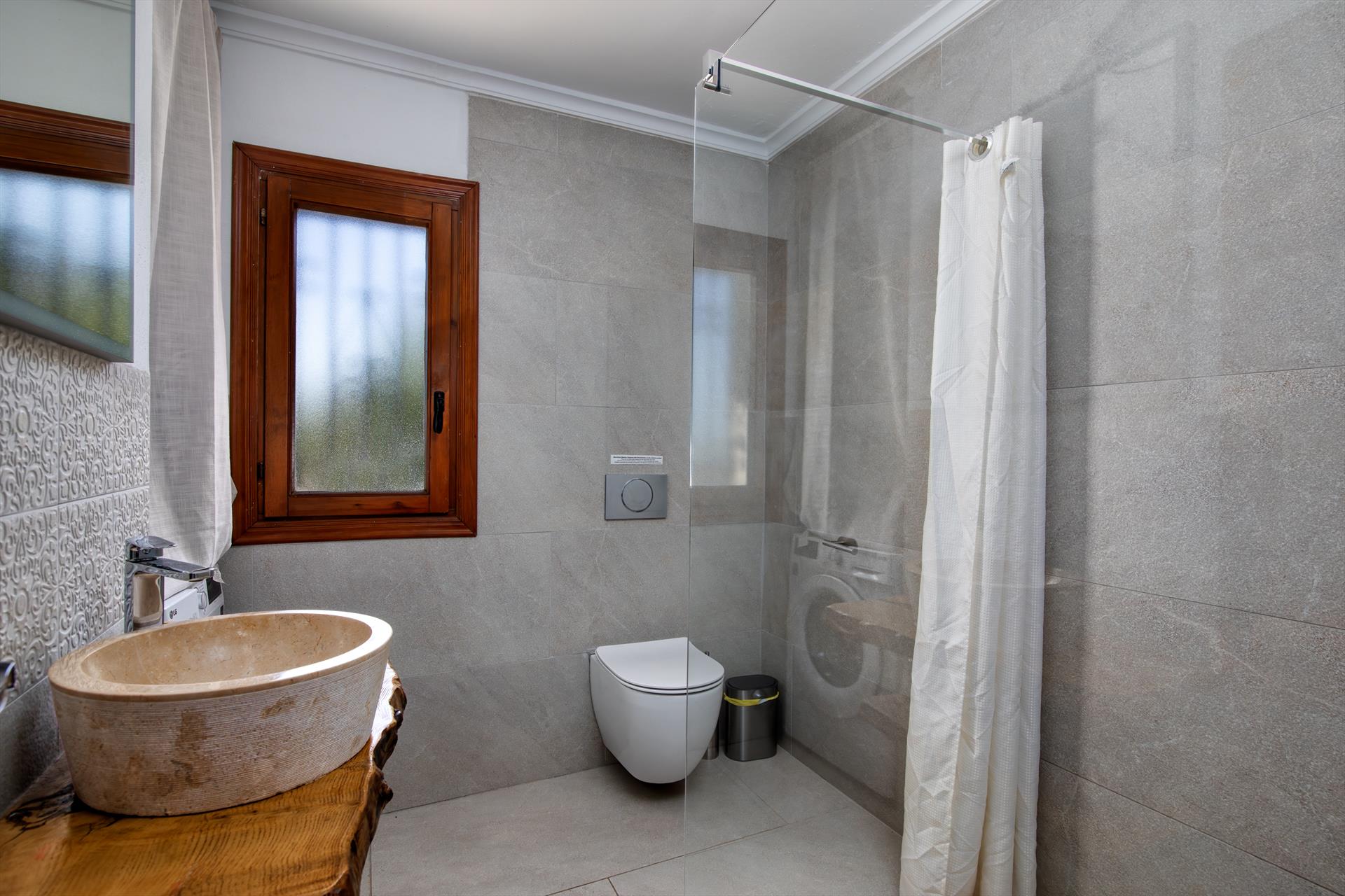 • salle de bains avec lavabo simple, douche, toilettes et sèche-cheveux