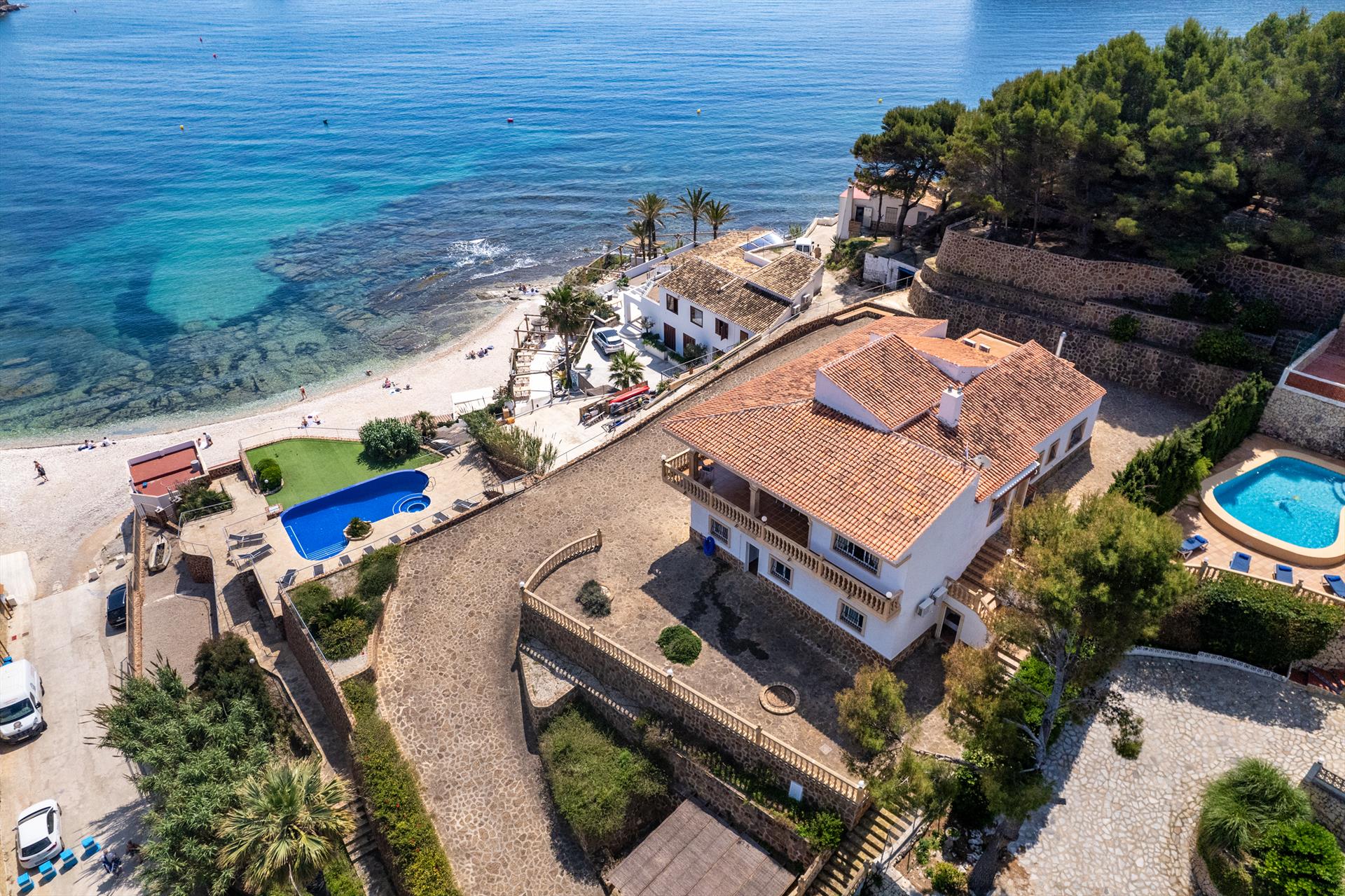 La villa dispose de 5 chambres et 3 salles de bains, réparties sur 2 niveaux. L'hébergement offre intimité, un beau jardin avec pelouse, gravier et arbres, une merveilleuse piscine et des vues magnifiques sur la baie, la plage et la mer. Son confort et la proximité de la plage, des activités sportives et des lieux de sortie font de cette villa un lieu idéal pour passer vos vacances en Espagne en famille ou entre amis, et même avec vos animaux de compagnie.