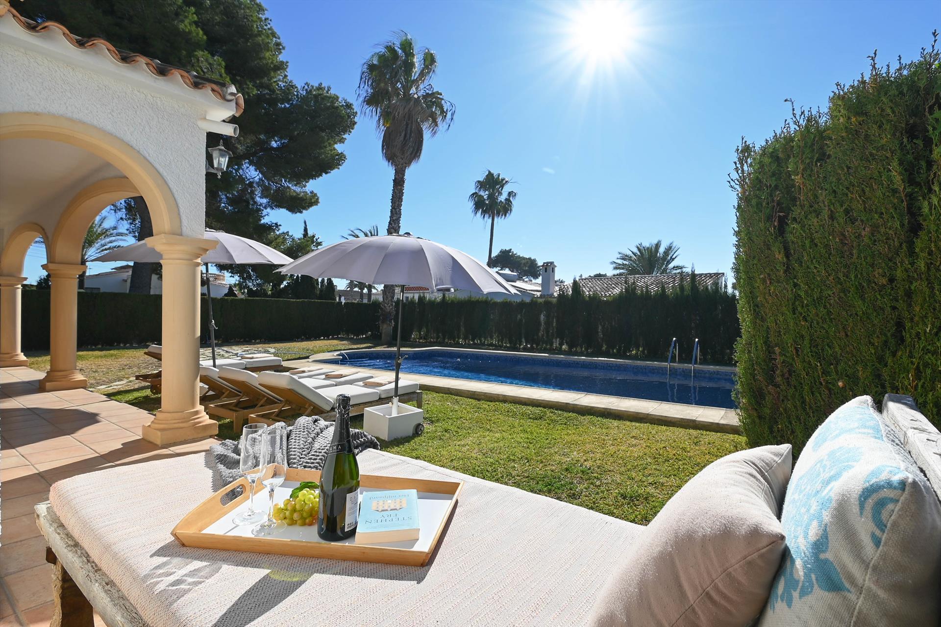 Magnifique et confortable villa avec piscine privée à Xàbia, Costa Blanca, Espagne, pour 4 personnes. La maison est située dans une zone côtière, vallonnée, boisée et résidentielle, à proximité de restaurants et bars, supermarchés, d'un court de tennis et à 2 km de la plage d'Ambolo, Xàbia.