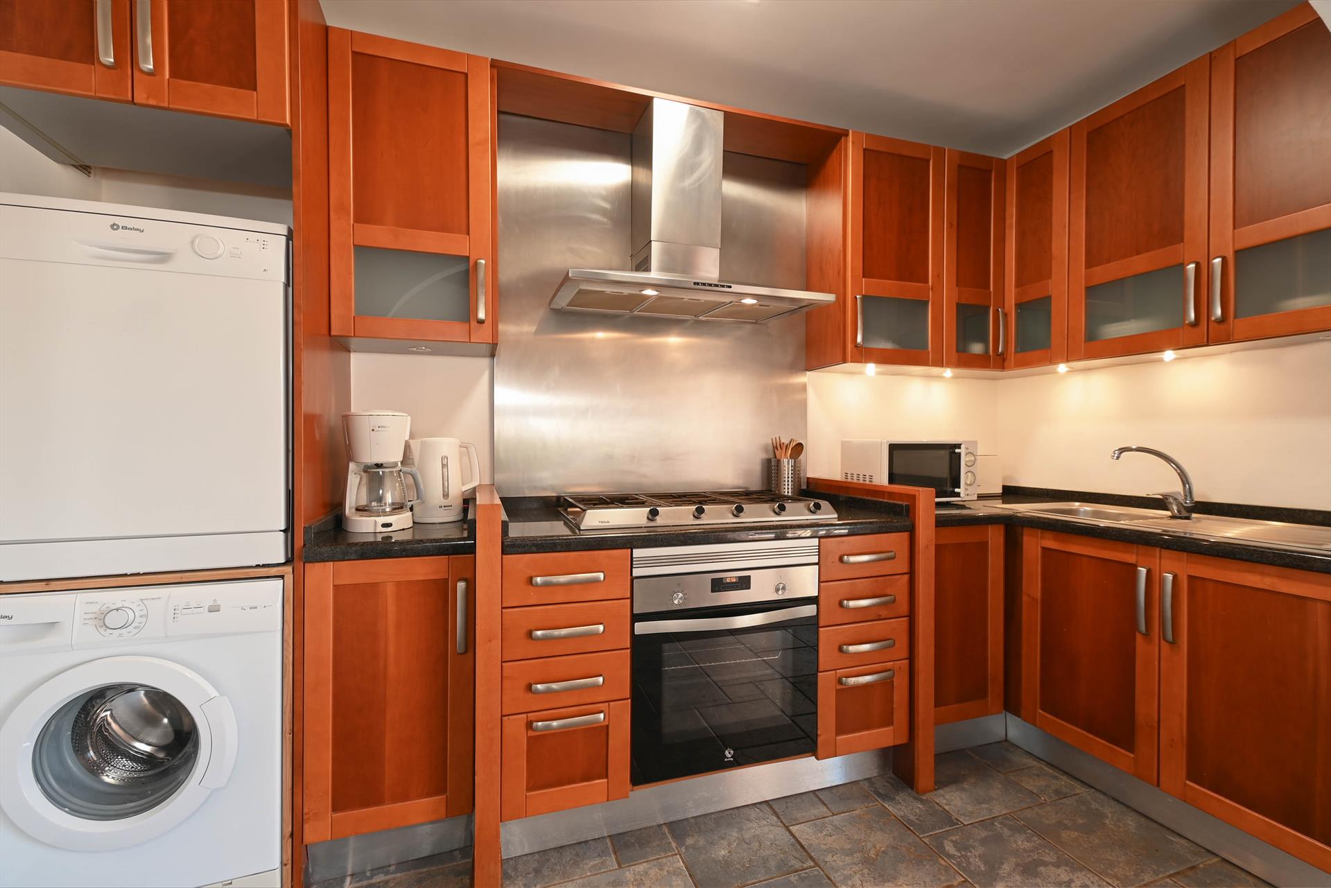 • cuisine ouverte avec plaque de cuisson au gaz, four électrique, micro-ondes, lave-vaisselle, réfrigérateur-congélateur, cafetière, bouilloire électrique, mixeur, grille-pain et extracteur de jus