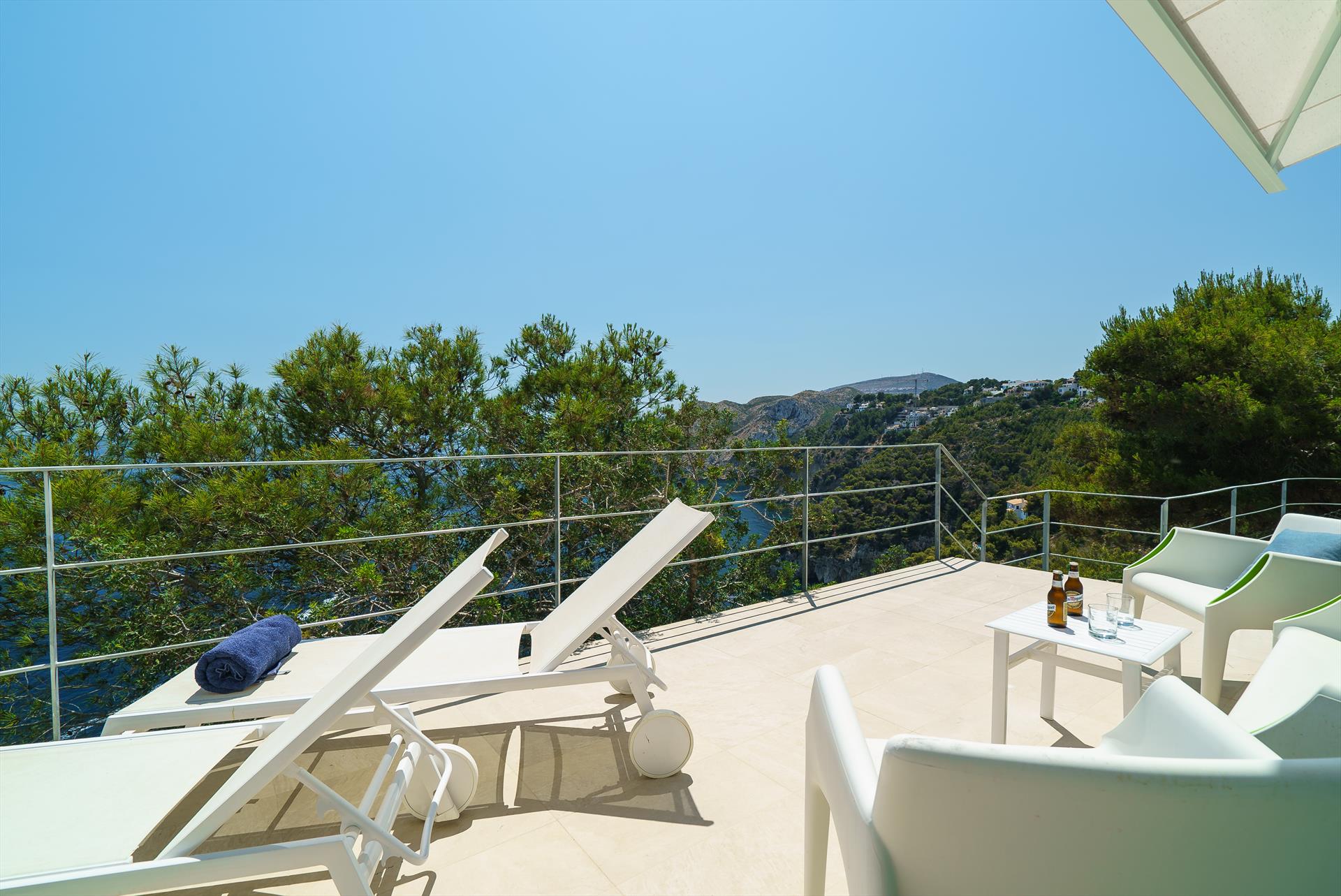 Villa moderne et romantique de luxe à Jávea, Costa Blanca, Espagne avec piscine privée pour 6 personnes. La villa est située dans un quartier résidentiel et montagneux près de la plage et se trouve à 3 km de La Granadella, plage de Jávea.