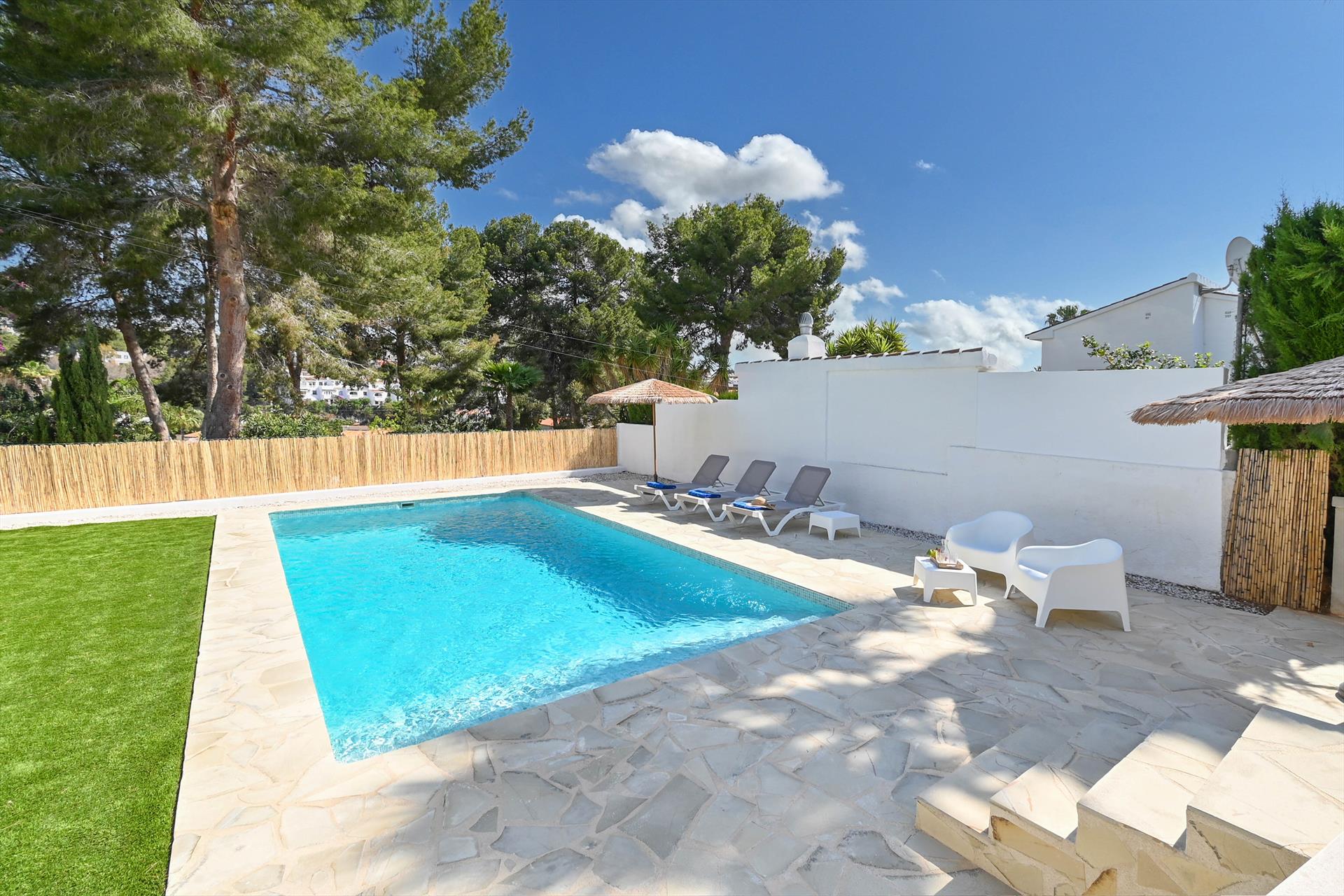 Merveilleuse et classique villa avec piscine privée à Moraira, Costa Blanca, Espagne pour 4 personnes. La maison est située dans une zone côtière et résidentielle, proche des commerces, à 1 km de la plage de Playa de les Platgetes et à 1 km de la mer Méditerranée.