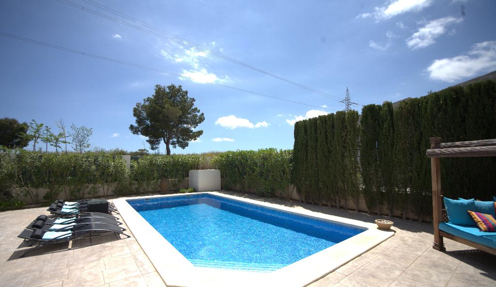 Villa moderne et confortable avec piscine privée à Polop, Costa Blanca, Espagne, pour 8 personnes. La maison est située dans un quartier résidentiel vallonné et se trouve à 5 km de La Nucia.